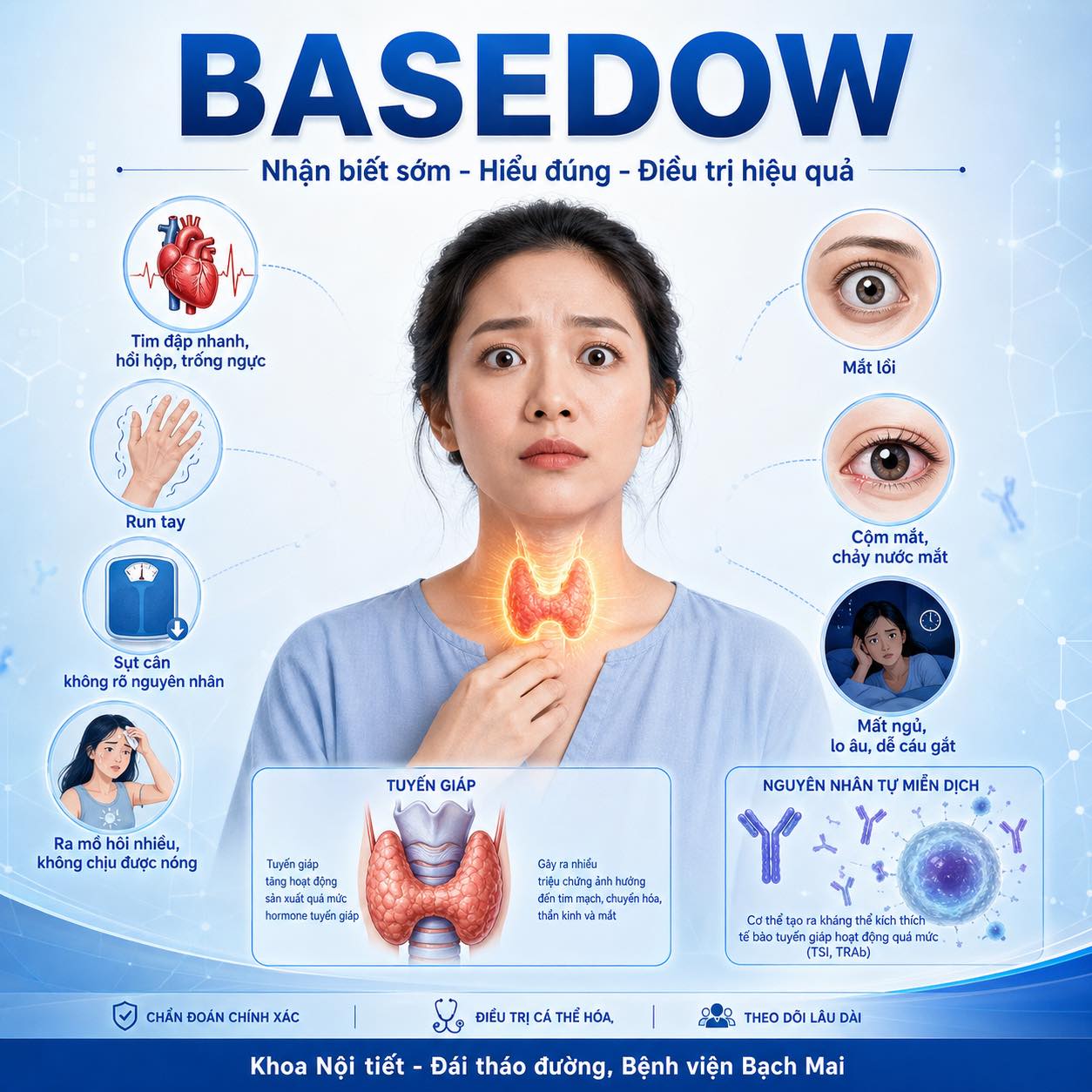Basedow là bệnh có thể kiểm soát tốt, nhưng cũng là bệnh có nguy cơ tái phát. Có người đáp ứng tốt với thuốc và duy trì ổn định lâu dài. Có người cần iod phóng xạ hoặc phẫu thuật. Có người phải điều trị phối hợp bệnh mắt. Có người cần theo dõi đặc biệt vì bệnh tim mạch, tuổi cao, thai kỳ hoặc nguy cơ biến chứng.