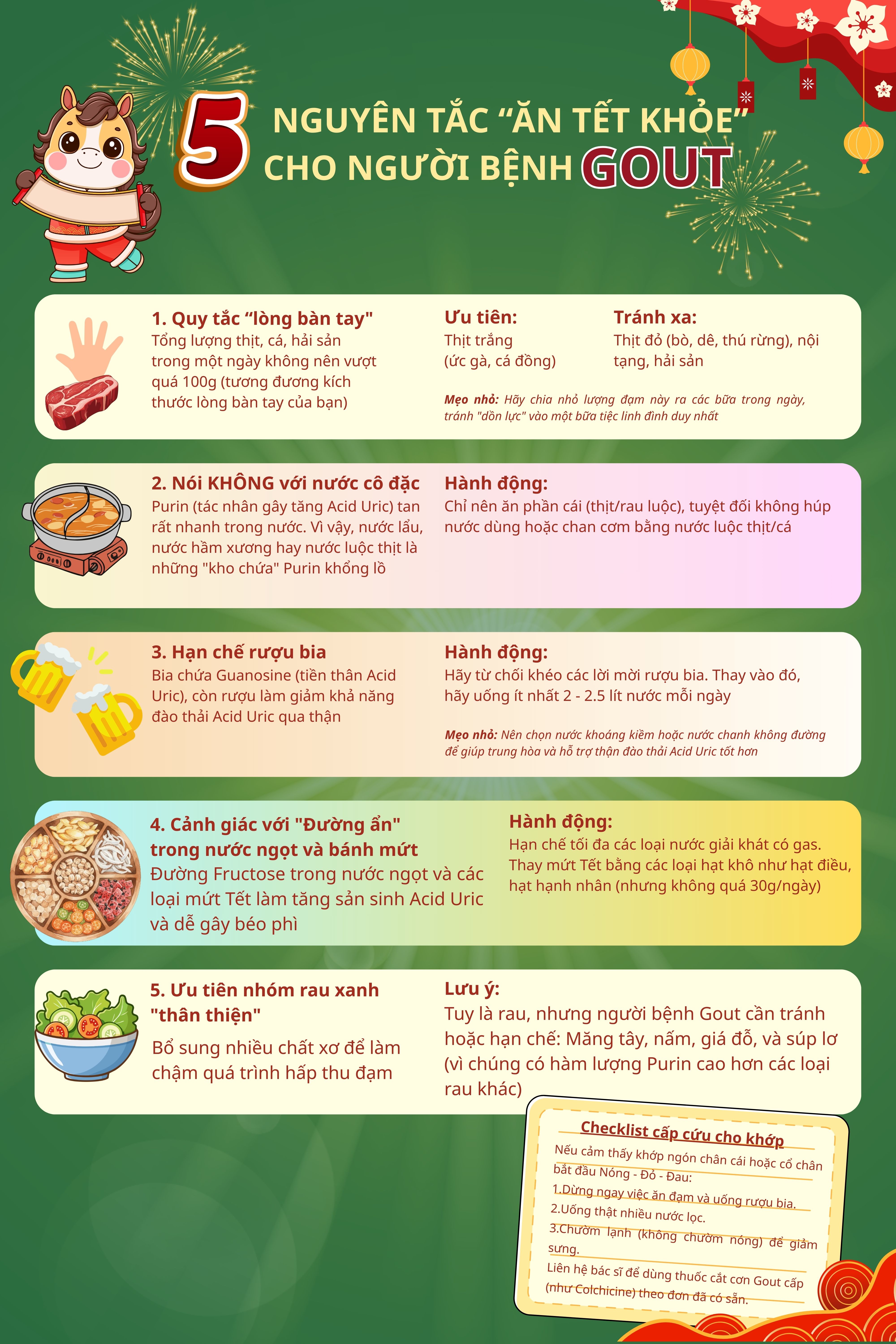Giữa không khí náo nức của chợ hoa và những buổi tiệc tất niên kéo dài từ sáng đến đêm, chúng ta mải mê chọn giò chả, sắm bánh chưng mà đôi khi quên bẵng “cơn đau” đang trực chờ dưới kẽ khớp. Những mâm cỗ đầy ắp thịt bò, hải sản và rượu bia chính là thử thách cực đại cho đôi chân của người bệnh Gout. Đừng để niềm vui sum vầy bị dập tắt bởi sự chủ quan trên bàn tiệc. Lưu ngay 5 nguyên tắc dưới đây để vừa tận hưởng trọn vị Tết, vừa giữ cho Acid Uric luôn nằm trong vùng an toàn!