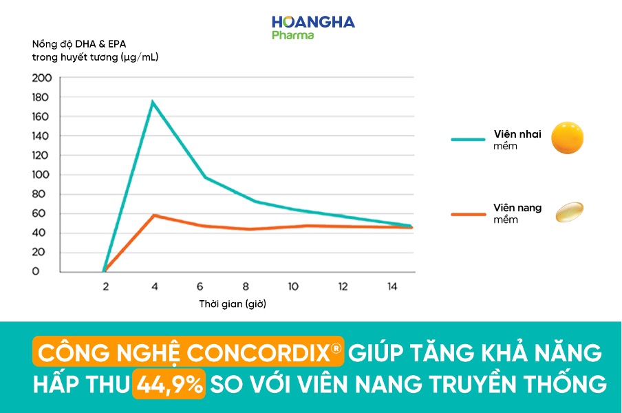 Như vậy có thể thấy rằng viên nhai mềm ứng dụng công nghệ ConCordix® giúp hấp thu DHA vượt trội hơn so với viên nang truyền thống, một ưu điểm quan trọng khi bổ sung DHA cho trẻ nhỏ.