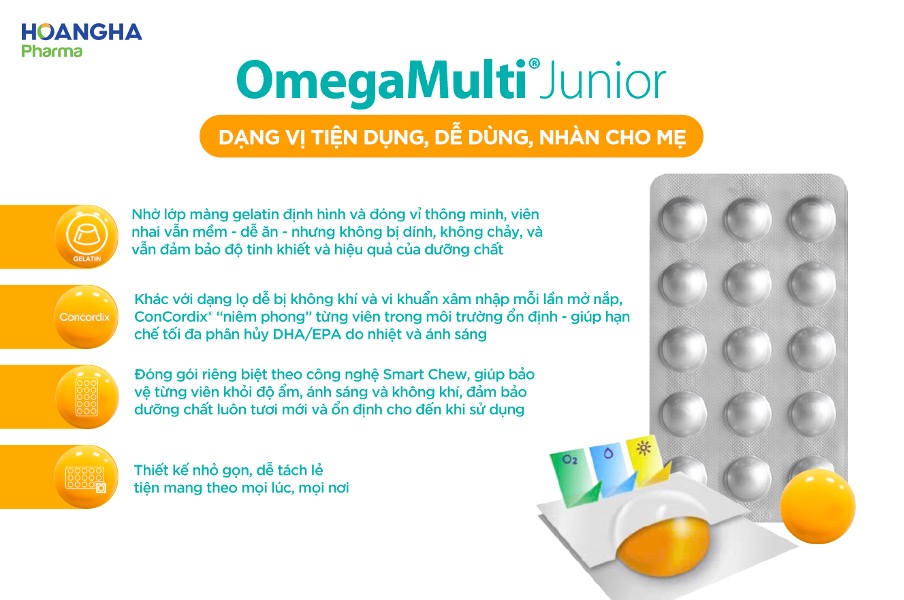 Với hàm lượng DHA cao 215mg/viên nhai, TPBVSK Omega Multi Junior không chỉ hỗ trợ phát triển trí não, thị lực mà còn nổi bật nhờ sự kết hợp của 11 vi chất thiết yếu gồm vitamin D3, K2MK7, Cholin, Quatrefolic®. Công thức này hỗ trợ tăng cường miễn dịch, hỗ trợ phát triển chiều cao, thúc đẩy quá trình trao đổi chất mang lại nền tảng sức khỏe toàn diện từ bên trong.