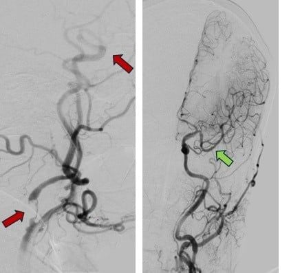 Hình ảnh mạch máu bị tắc (mũi tên đỏ) và sau khi được tái thông hoàn toàn (mũi tên xanh) (ảnh: BV)