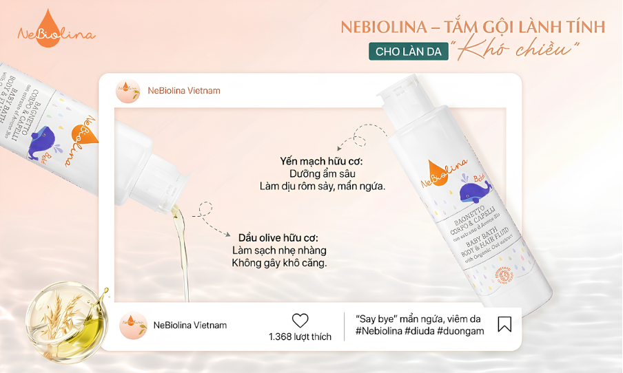 Với thành phần chiết xuất yến mạch hữu cơ và dầu olive, sản phẩm giúp làm sạch dịu nhẹ, chăm sóc và bảo vệ da & tóc bé, không gây khô hay kích ứng. Bên cạnh đó, sữa tắm gội NeBiolina cũng được kiểm soát nồng độ kim loại nặng dưới 0.04ppm và cam kết loại bỏ hoàn toàn những chất gây hại cho sức khoẻ như SLS, SLES, cồn, paraben.