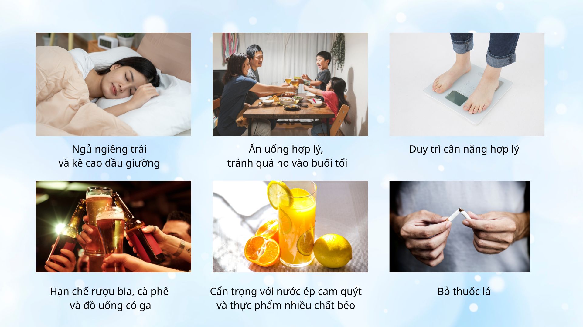 Ăn tối sớm, cách giờ đi ngủ ít nhất 2-3 tiếng, đồng thời giảm khẩu phần bữa tối là biện pháp quan trọng giúp hạn chế trào ngược về đêm. Việc chia nhỏ bữa ăn trong ngày cũng giúp giảm áp lực lên dạ dày và cơ thắt thực quản dưới - “van” ngăn axit trào ngược. Đi ngủ khi thức ăn chưa tiêu hóa hết, đặc biệt sau bữa ăn nhiều, dễ làm triệu chứng GERD trầm trọng hơn.