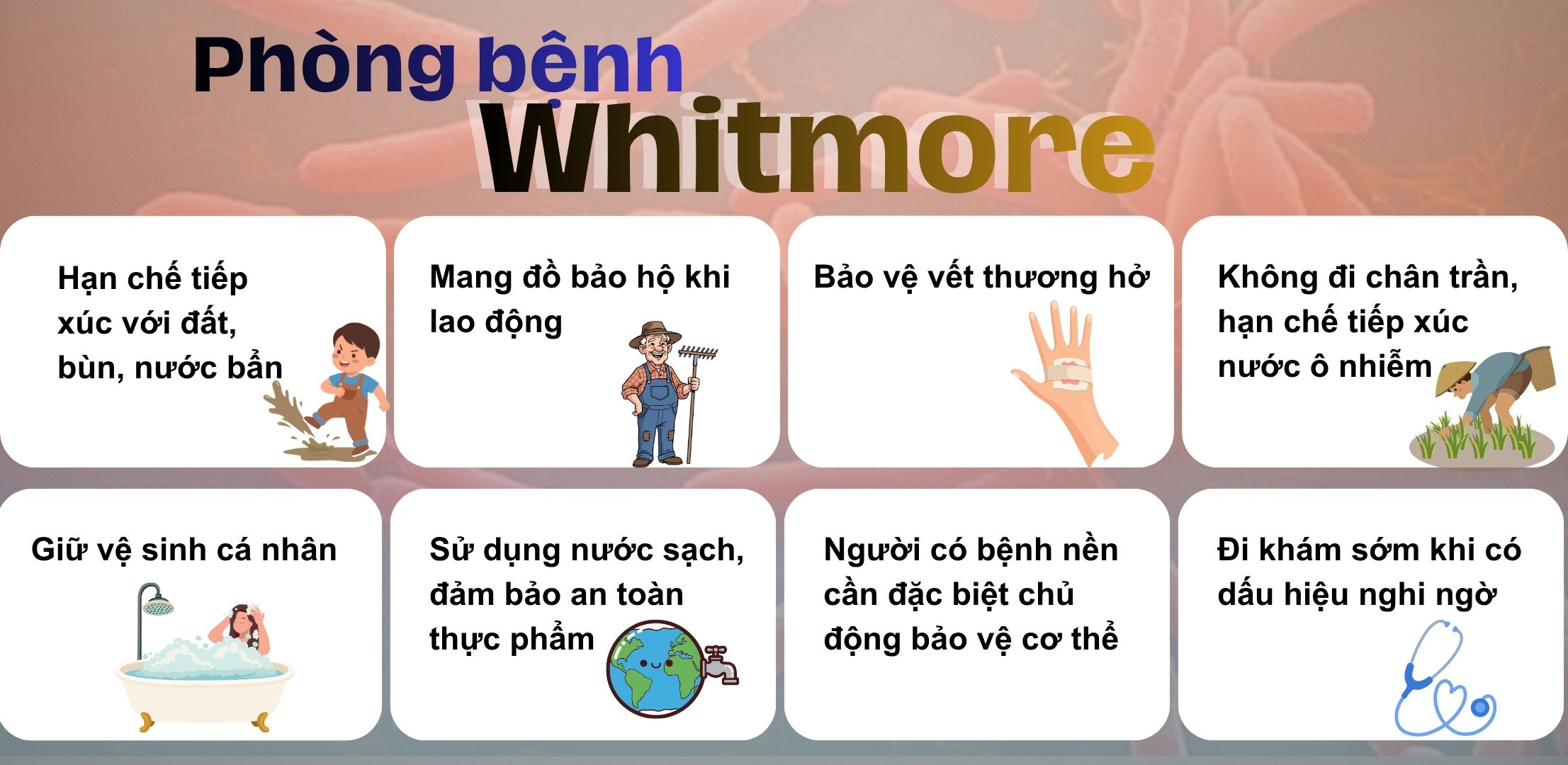 Các chuyên gia lưu ý, Whitmore không phải bệnh lây lan phổ biến từ người sang người, nhưng có thể diễn tiến rất nặng nếu phát hiện muộn. Phòng bệnh chủ động vẫn là giải pháp quan trọng nhất.