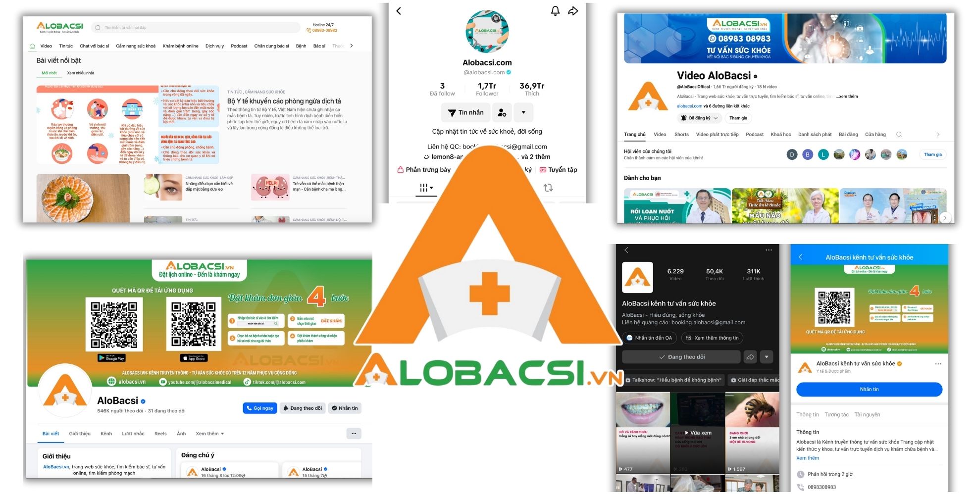 AloBacsi hiện diện trên Website AloBacsi.com, cùng các kênh Facebook, YouTube, TikTok, Zalo OA chính thức đều có tích xanh, với logo chuẩn hai màu xanh lá và cam, trong đó chữ “A” cách điệu cùng dấu thập đỏ. Đây là dấu hiệu nhận diện xuyên suốt, đã được đăng ký và sử dụng nhiều năm qua.