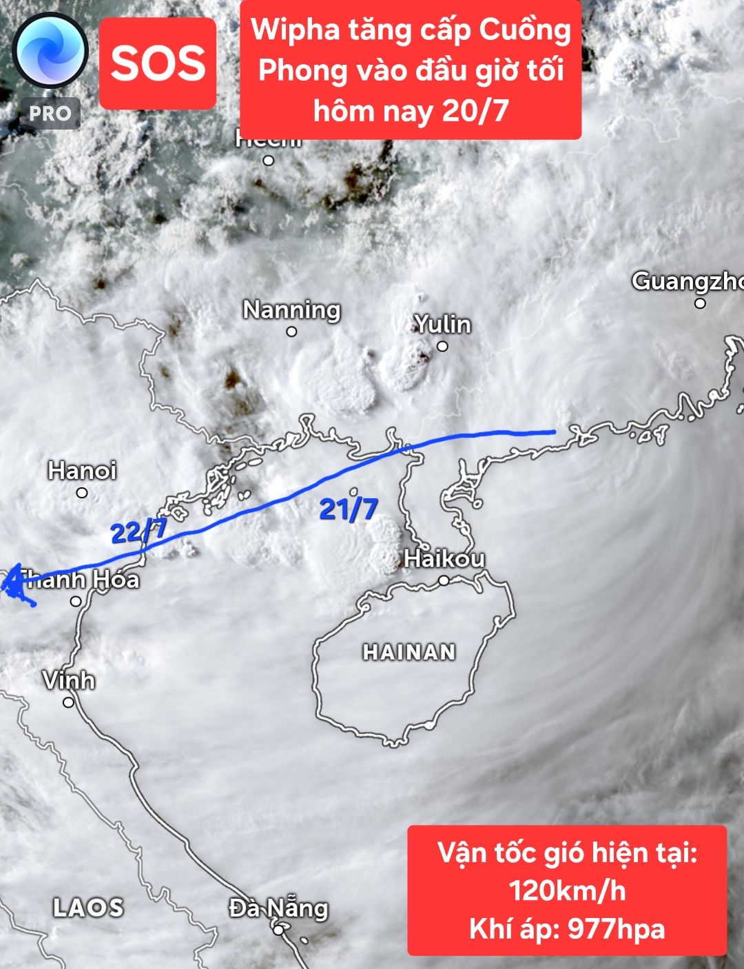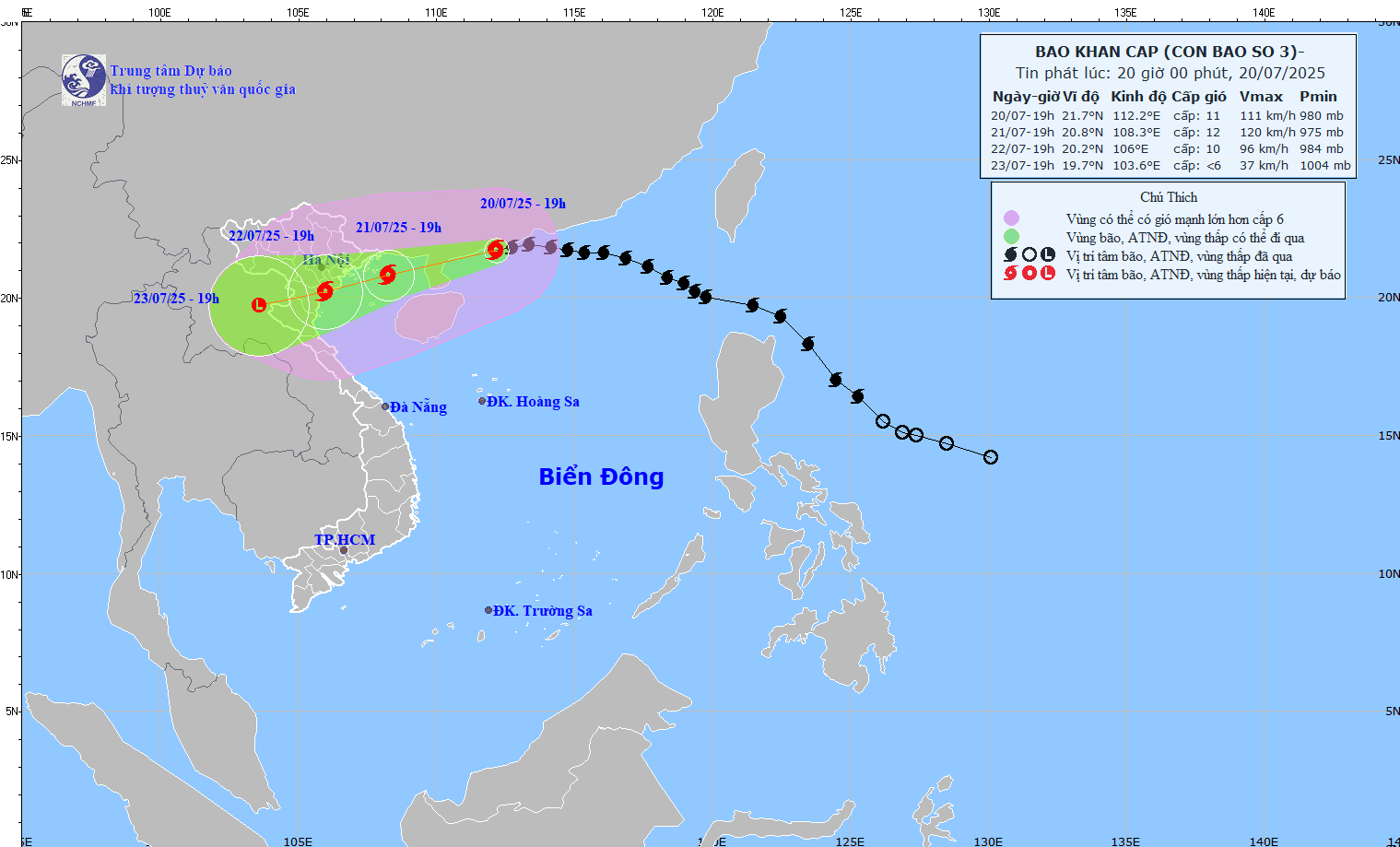Vào 20 giờ, ngày 20/7/2025, Trung tâm Dự báo Khí tượng Thủy văn Quốc gia phát tin khẩn cấp về cơn bão số 3 - WHIPHA. Tâm bão đang cách Quảng Ninh - Hải Phòng khoảng 480km, sức gió cấp 11 (103-117km/h), giật cấp 14, di chuyển nhanh theo hướng Tây. Dự báo đến tối 21/7, bão sẽ đi sâu vào Bắc vịnh Bắc Bộ, đạt cường độ mạnh nhất cấp 11-12, giật cấp 15, sau đó ảnh hưởng trực tiếp vùng ven biển từ Quảng Ninh đến Thanh Hóa, rồi suy yếu khi tiến vào đất liền.