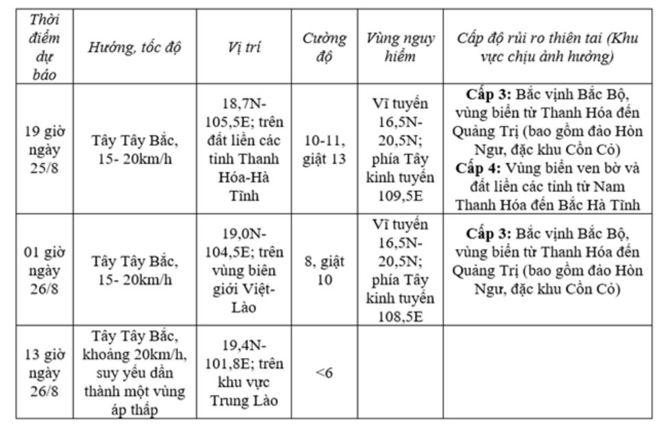 Hồi 13 giờ ngày 25/8, vị trí tâm bão ở vào khoảng 18,5 độ Vĩ Bắc; 106,3 độ Kinh Đông, trên vùng biển ven bờ khu vực Nghệ An-Hà Tĩnh. Sức gió mạnh nhất vùng gần tâm bão mạnh cấp 13 (134-149km/giờ), giật cấp 16; di chuyển theo hướng Tây Tây Bắc với tốc độ 15-20km/giờ.