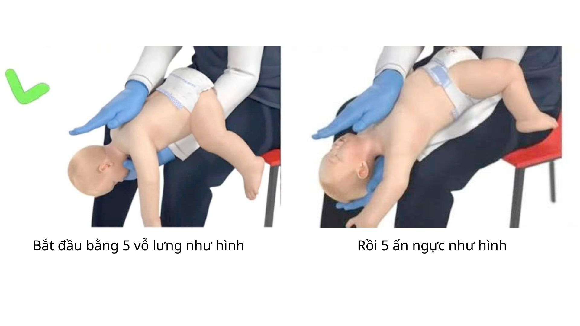Vỗ lưng 5 lần: Đặt trẻ nằm sấp trên cẳng tay; đầu thấp hơn thân, giữ chắc cằm và hàm; dùng gót bàn tay vỗ mạnh, dứt khoát 5 cái vào vùng giữa hai xương bả vai
