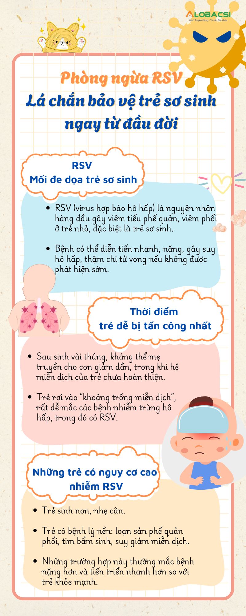 Tưởng chừng được bảo vệ tuyệt đối sau khi chào đời, nhưng vài tháng đầu lại là giai đoạn bé dễ tổn thương nhất. Khi kháng thể mẹ dần biến mất, RSV có thể âm thầm tấn công, gây bệnh hô hấp nặng. Cha mẹ hãy chủ động phòng ngừa ngay hôm nay để bé an toàn và khỏe mạnh từng hơi thở đầu đời.