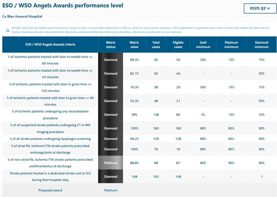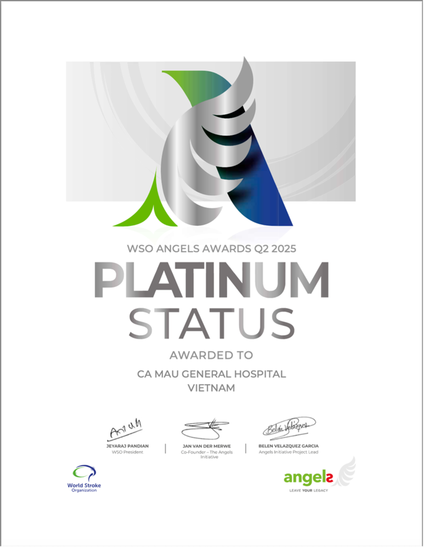 Nhờ những nỗ lực không ngừng, Bệnh viện Đa khoa Cà Mau đã vinh dự đạt Giải Bạch kim WSO Angels Award - một trong những giải thưởng danh giá trong lĩnh vực điều trị đột quỵ. Kết quả nổi bật thể hiện qua các tiêu chí: tỷ lệ điều trị tái thông đạt 58%, thời gian cửa - kim dưới 45 phút đạt 86%, thời gian cửa - bẹn dưới 90 phút đạt 72%, và hơn 90% bệnh nhân sau xuất viện được dự phòng tái phát.