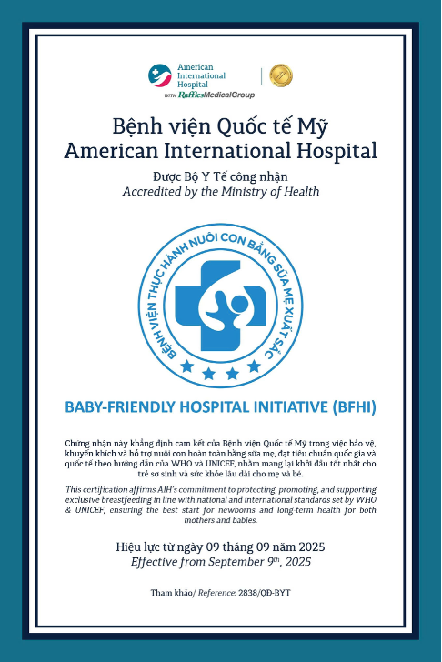 Ngày 9/9/2025, Bệnh viện Quốc tế Mỹ (AIH, TPHCM) chính thức được Bộ Y tế công nhận là “Bệnh viện thực hành nuôi con bằng sữa mẹ xuất sắc” (Breastfeeding-Friendly Hospital Initiative - BFHI). Đây là một dấu mốc quan trọng, phản ánh nỗ lực của bệnh viện trong việc thúc đẩy nuôi con bằng sữa mẹ hoàn toàn theo khuyến cáo của WHO và UNICEF.