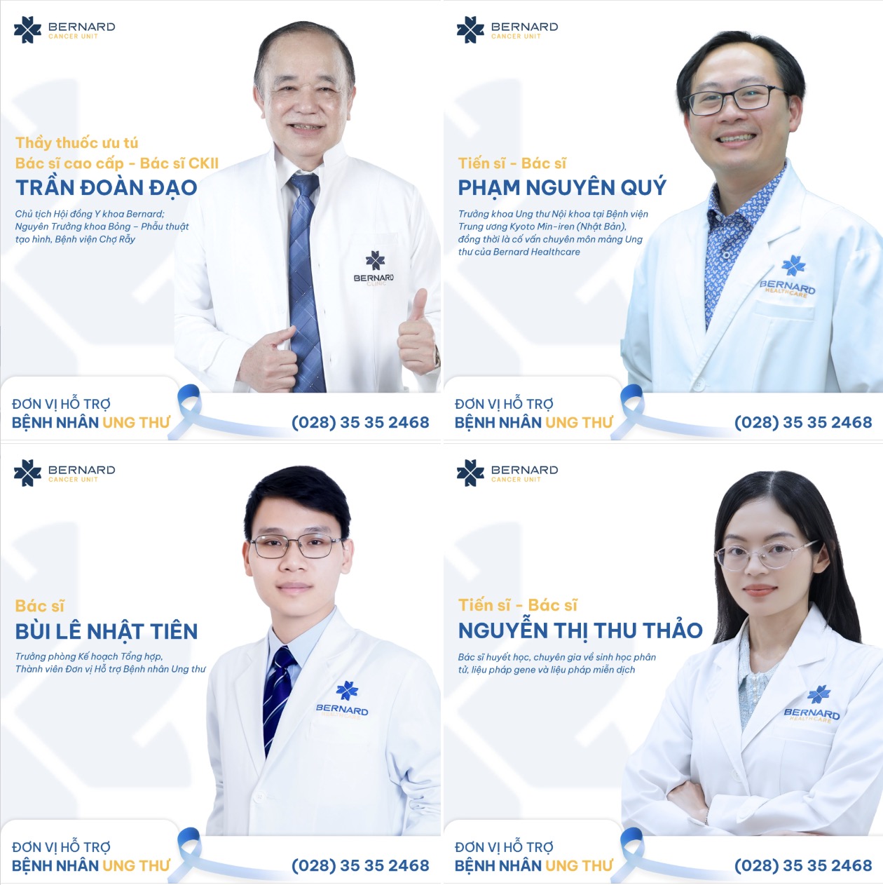 Thành viên của Đơn vị Hỗ trợ Bệnh nhân Ung thư gồm nhiều chuyên gia giàu kinh nghiệm như TTƯT.BS.CK2 Trần Đoàn Đạo - Chủ tịch Hội đồng Y khoa Bernard, nguyên Trưởng khoa Bỏng - Phẫu thuật tạo hình, Bệnh viện Chợ Rẫy; TS.BS Phạm Nguyên Quý - Trưởng khoa Ung thư Nội khoa tại Bệnh viện Trung ương Kyoto Min-iren (Nhật Bản), đồng thời là cố vấn chuyên môn mảng Ung thư của Bernard Healthcare; TS.BS Nguyễn Thị Thu Thảo - bác sĩ huyết học, chuyên gia về sinh học phân tử, liệu pháp gene và liệu pháp miễn dịch; cùng BS Bùi Lê Nhật Tiên - Trưởng phòng Kế hoạch Tổng hợp.