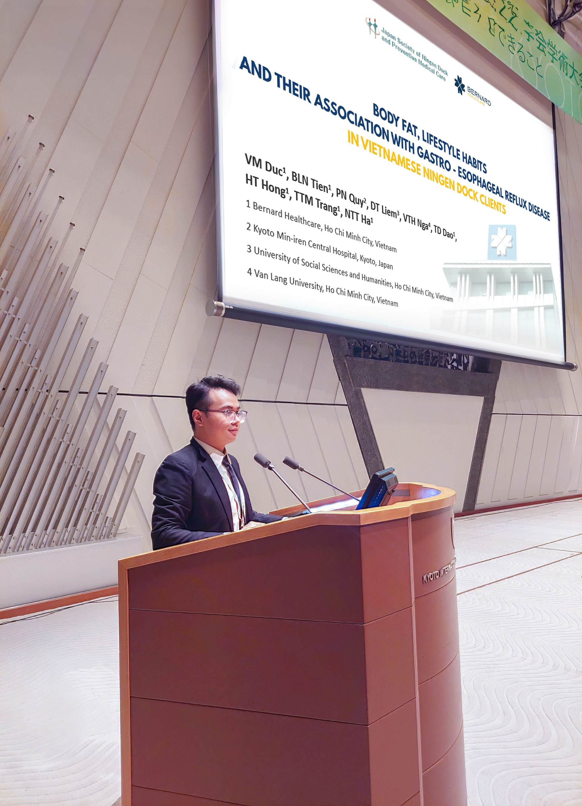 Tại hội nghị năm nay, Bernard Healthcare tiếp tục gây chú ý với hai nghiên cứu nổi bật: Double Reading and Discrepancies in Diagnostic Imaging: A Cross-Sectional Study at Bernard Healthcare and University of Yamanashi Hospital (Tham vấn ý kiến thứ hai trong chẩn đoán hình ảnh - hợp tác Bernard Healthcare và Bệnh viện Đại học Yamanashi) và Body Fat, Lifestyle Habits and Their Association with Gastroesophageal Reflux Disease in Vietnamese Ningen Dock Clients (Tỷ lệ mỡ cơ thể, thói quen lối sống và mối liên quan với bệnh GERD ở khách hàng Ningen Dock Bernard Healthcare).