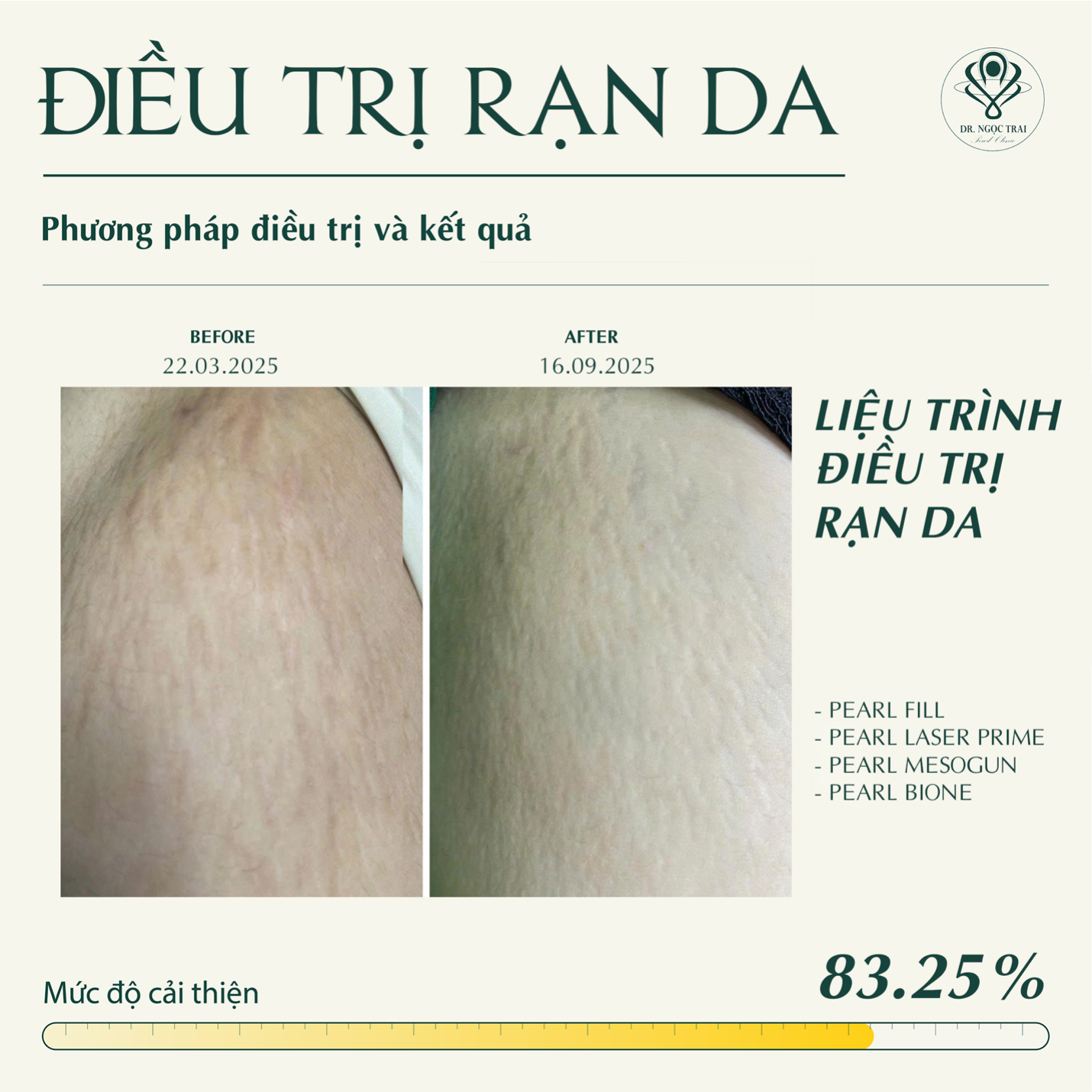 Sau tất cả, những vết rạn - từng là “dấu vết hạnh phúc” nhưng cũng đầy nước mắt - giờ đây không còn là nỗi ám ảnh bất biến. Công nghệ Bi-one® cùng Liệu pháp sinh học toàn diện của TS.BS Ngọc Trai mang đến cơ hội thứ hai cho làn da của các bà mẹ và mọi người bị rạn: cơ hội được tái sinh, được khoẻ mạnh và xinh đẹp như vốn có. Và hơn hết, đó là cơ hội để mỗi người phụ nữ yêu cơ thể mình thêm một lần nữa, tự tin tiếp tục hành trình làm mẹ và tận hưởng trọn vẹn cuộc sống.