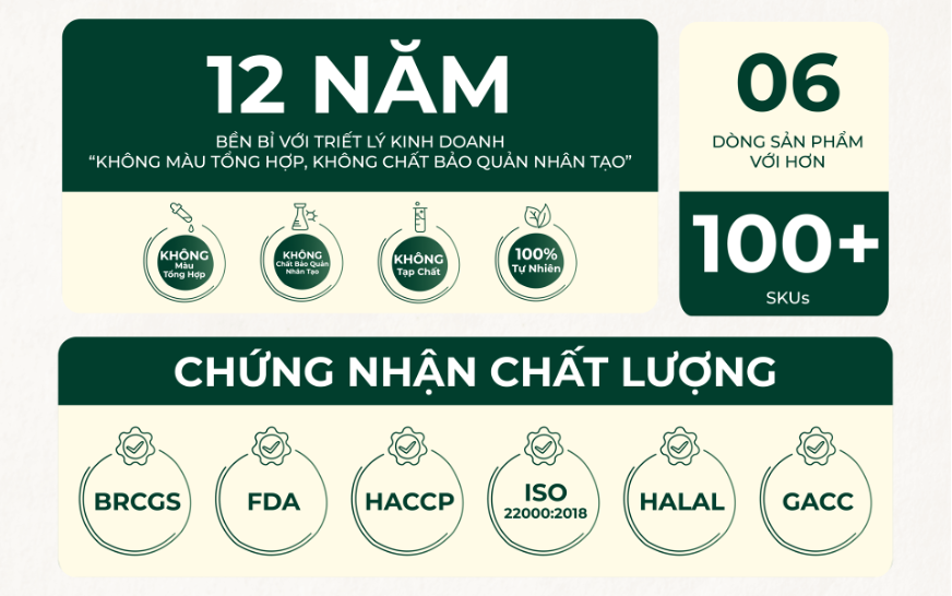 Trước hết, thương hiệu kiên định với nguyên tắc không sử dụng màu tổng hợp và không dùng chất bảo quản nhân tạo, nhằm giữ lại hương vị và màu sắc vốn có của nguyên liệu tự nhiên.