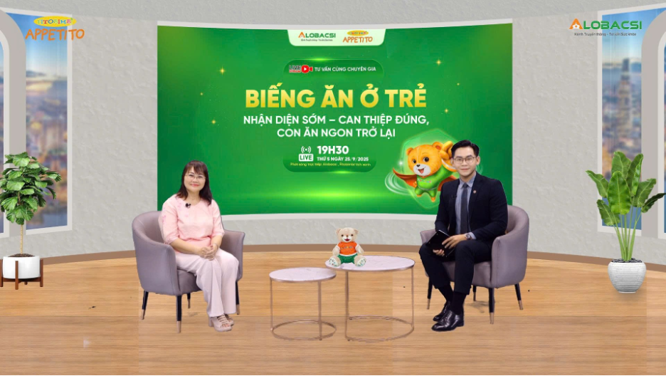 Ngày 25/9/2025, AloBacsi phối hợp cùng Nhãn hàng Fitobimbi Appetito - Siro ăn ngon 3 tác động nhập khẩu nguyên hộp từ Italy tổ chức chương trình tư vấn trực tuyến với chủ đề “Biếng ăn ở trẻ - Nhận diện sớm, can thiệp đúng, con ăn ngon trở lại”. Với sự tham gia của TS.BS.CK2 Nguyễn Thị Thu Hậu, chương trình đã thu hút hơn 664.000 lượt xem - một lần nữa khẳng định biếng ăn luôn là nỗi lo thường trực của hàng triệu phụ huynh Việt.