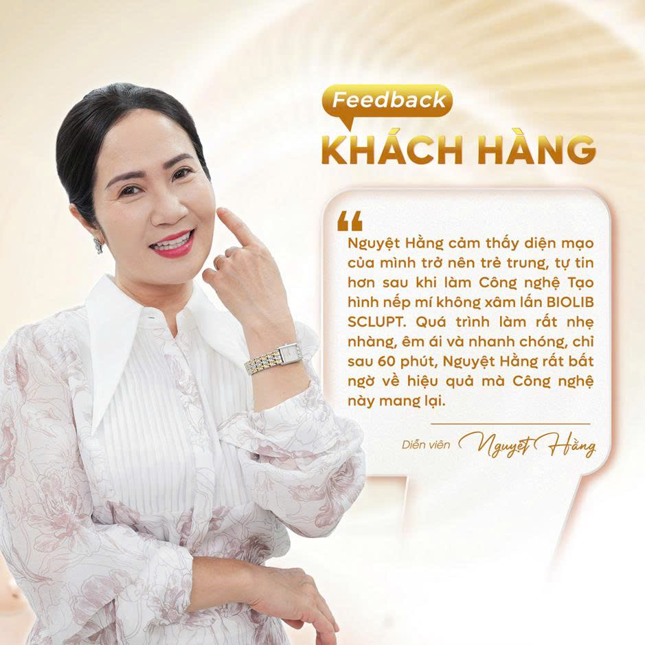 Không phải ngẫu nhiên mà BIOLIB SCLUPT trở thành công nghệ được ưa chuộng trong giới nghệ thuật - nơi nhan sắc và biểu cảm đôi mắt ảnh hưởng trực tiếp đến cơ hội nghề nghiệp. Chỉ sau 60 phút trải nghiệm Công nghệ, các Nghệ sĩ/Diễn viên: Mai Thu Huyền, Nguyệt Hằng, Ngọc Anh đã sở hữu diện mạo rạng rỡ và thần thái thu hút hơn bao giờ hết.