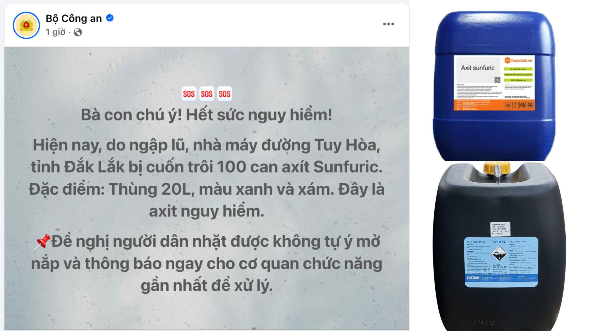 Công an tỉnh Đắk Lắk vừa phát đi cảnh báo khẩn sau khi 100 can axit sunfuric (H₂SO₄) của Nhà máy đường Tuy Hòa bị lũ cuốn trôi. Các can hóa chất này có dung tích 20 lít, màu xanh hoặc xám, trôi dạt trên sông suối và nhiều khu vực dân cư có nguy cơ tiếp cận.