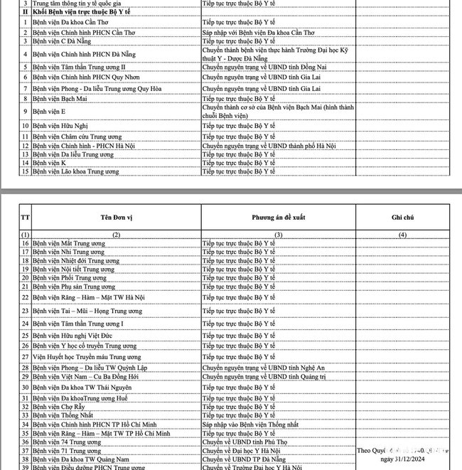 Theo phương án mới, Bộ Y tế đề xuất chuyển 13 đơn vị về địa phương quản lý và tổ chức lại 11 đơn vị khác. Trong đó, các bệnh viện đầu ngành như Bạch Mai, Việt Đức, K, Nhi Trung ương, Phụ sản Trung ương, Chợ Rẫy, Thống Nhất... tiếp tục trực thuộc Bộ, đảm bảo vai trò đầu tàu trong điều trị, nghiên cứu và đào tạo.