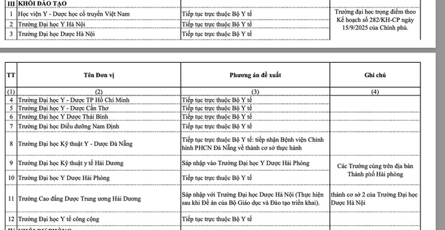 Với khối đào tạo, mạng lưới sẽ được tinh gọn và tăng tính liên thông. Cụ thể, Đại học Y Dược Hải Phòng tiếp nhận Đại học Kỹ thuật Y tế Hải Dương, còn Cao đẳng Dược Trung ương Hải Dương sáp nhập vào Đại học Dược Hà Nội. Các trường trọng điểm như Đại học Y Hà Nội, Đại học Y Dược TPHCM, Đại học Y Dược Cần Thơ, Đại học Điều dưỡng Nam Định vẫn trực thuộc Bộ Y tế.
