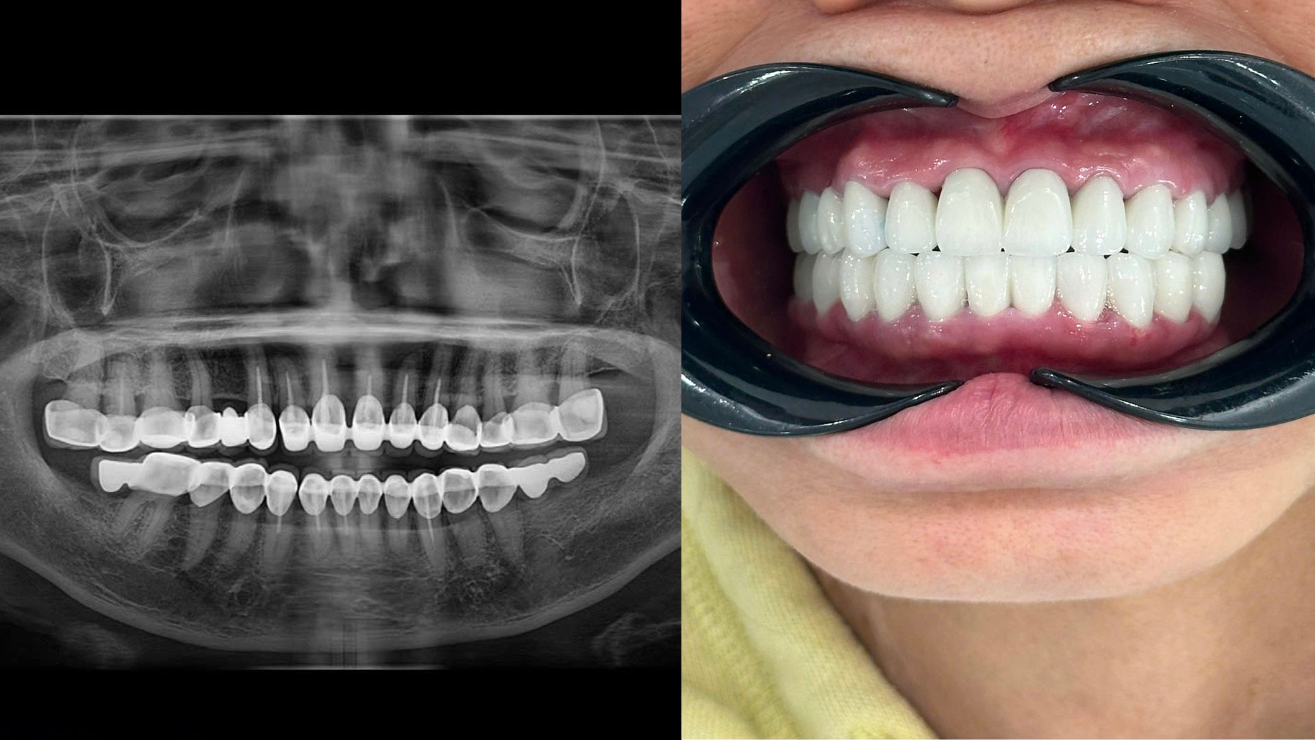 Qua thăm khám tổng quát và chụp X-quang, bác sĩ ghi nhận bệnh nhân đã bọc răng sứ toàn hàm trên và dưới, đồng thời từng lấy tủy 10 răng cửa. Tuy nhiên, dù đã lấy tủy nhưng nhiều răng vẫn còn đau nhức, ê buốt và có dấu hiệu viêm nhiễm quanh chân răng. Đặc biệt, phần răng sứ hàm dưới còn được làm cầu tại vị trí không có chân răng (3 cầu vói), các đường hoàn tất hở khiến thức ăn dễ mắc kẹt, gây hôi miệng nặng.