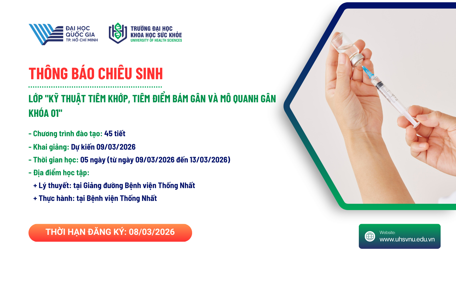 Trường Đại học Khoa học Sức khỏe - Đại học Quốc gia TPHCM vừa thông báo chiêu sinh lớp đào tạo liên tục “Kỹ thuật tiêm khớp, tiêm điểm bám gân và mô quanh gân - Khóa 01”, do Trung tâm Đào tạo kỹ năng nghề nghiệp y khoa tổ chức. Khóa học nhằm cập nhật kiến thức và rèn luyện kỹ năng thực hành tiêm nội khớp, tiêm mô quanh gân cho bác sĩ trong điều trị các bệnh lý cơ xương khớp thường gặp.