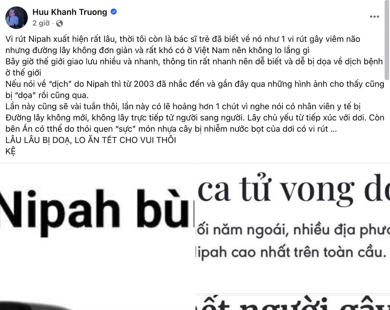 “Lâu lâu bị dọa một lần, rồi cũng qua. Cứ lo ăn Tết cho vui thôi”, BS Trương Hữu Khanh viết - một cách nói nửa đùa, nửa thật nhưng thể hiện rõ quan điểm không nên hoang mang thái quá trước các thông tin về virus Nipah.