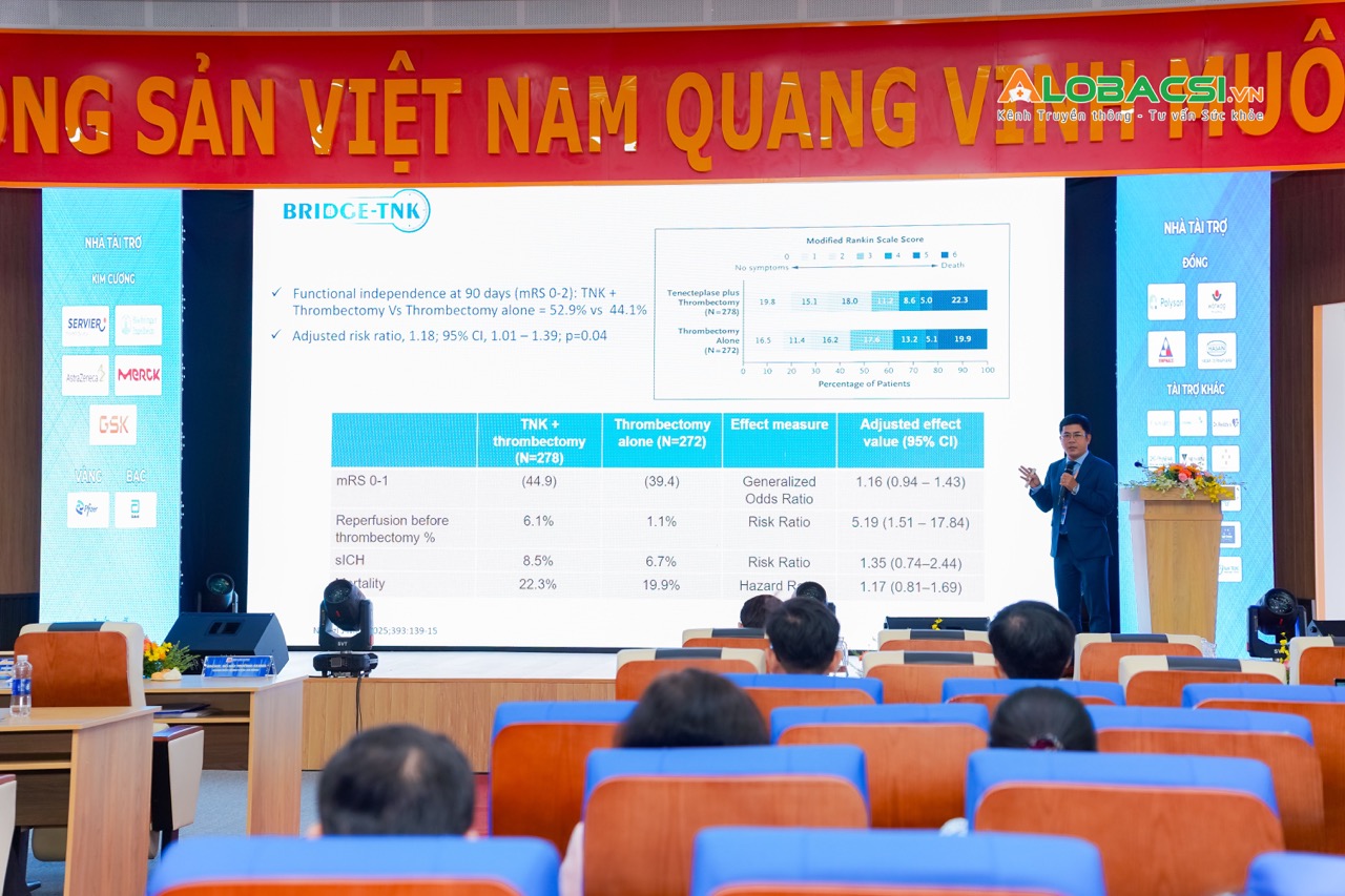 Bác sĩ dẫn chứng từ nghiên cứu BRIDGE-TNK (5/2025), một thử nghiệm lâm sàng then chốt trong lĩnh vực đột quỵ cấp, so sánh hai nhóm bệnh nhân tắc mạch lớn: nhóm chỉ lấy huyết khối cơ học (thrombectomy) và nhóm được “bắc cầu”, tức là tiêu huyết khối tĩnh mạch bằng TNK trước khi can thiệp. Kết quả cho thấy nhóm bắc cầu có tỷ lệ phục hồi tốt sau 3 tháng (mRS 0-1) cao hơn rõ rệt (44,9% so với nhóm chỉ can thiệp), khẳng định lợi ích của TNK trong việc tăng tỷ lệ tái thông và cải thiện kết cục chức năng cho bệnh nhân đột quỵ cấp.