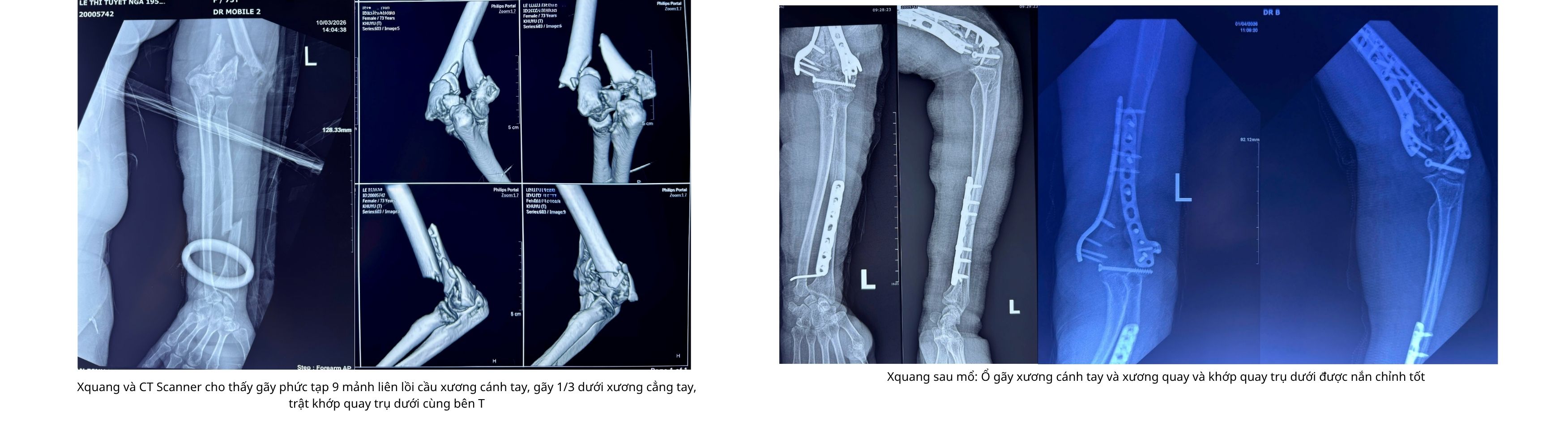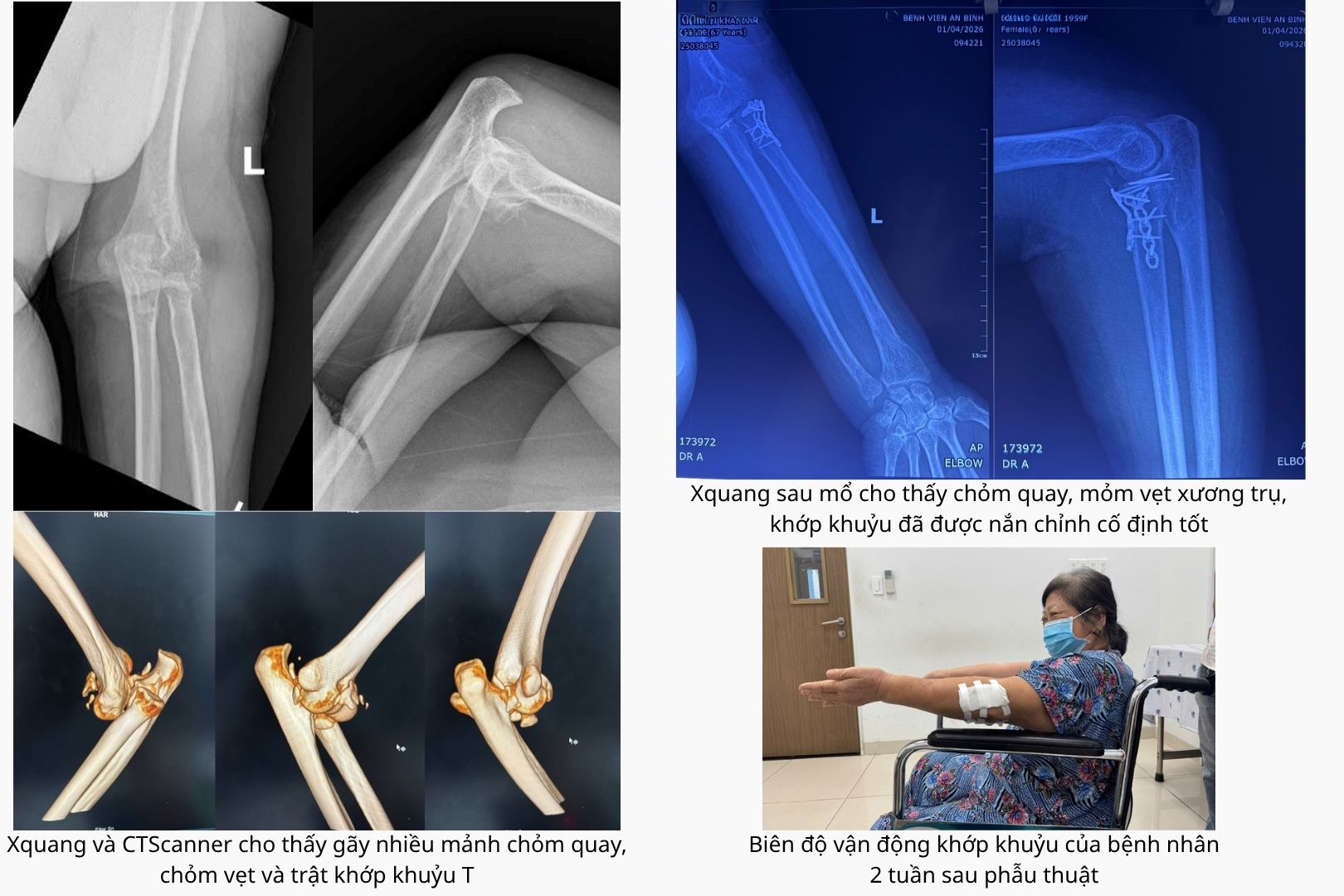 Ê-kíp phẫu thuật đã tiến hành kết hợp xương quay bằng nẹp vít, cố định mỏm vẹt xương trụ bằng kim Kirschner và khâu phục hồi dây chằng bên ngoài. Sau can thiệp, khớp khuỷu được tái lập vững chắc.