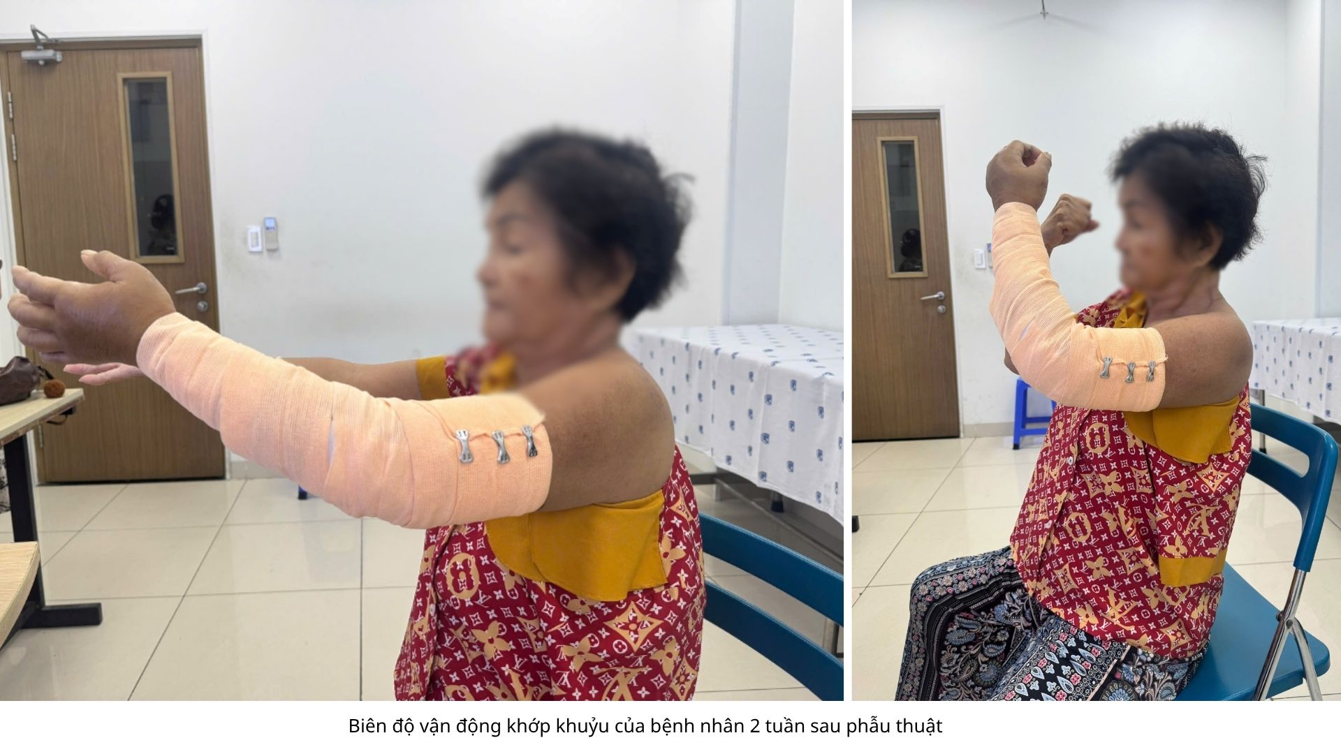 Kết quả, sau 2 tuần phẫu thuật, vết mổ của cả hai bệnh nhân liền tốt, biên độ vận động khớp khuỷu phục hồi đáng kể.