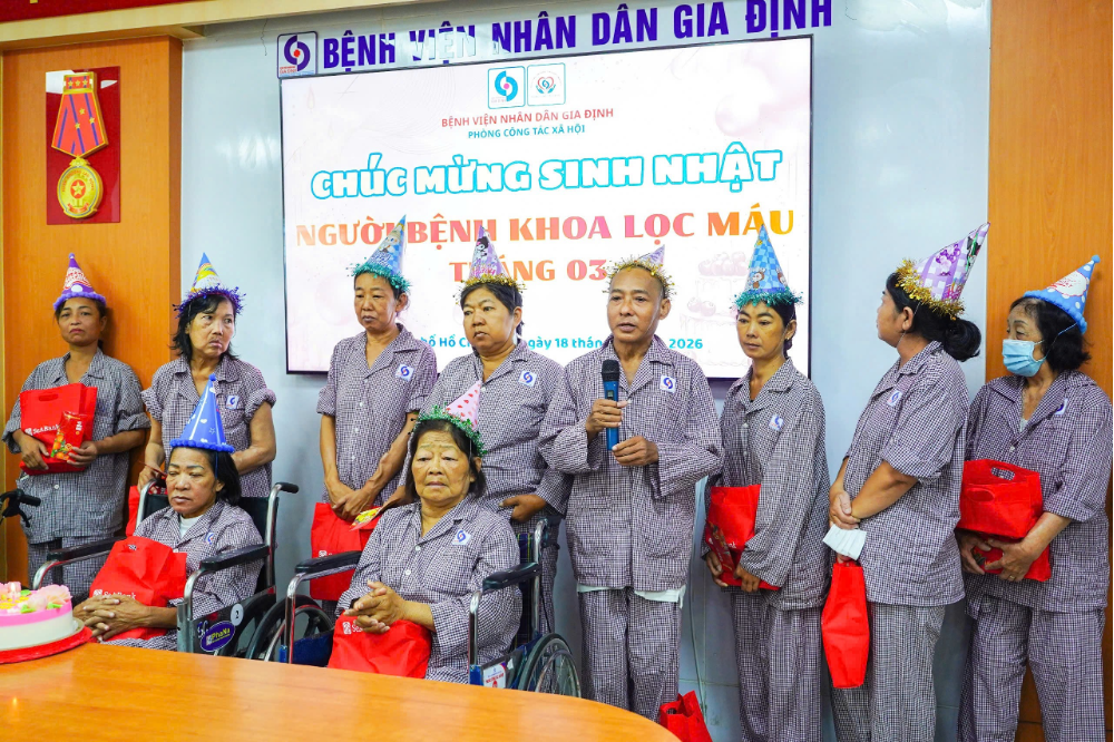 Sáng 18/3/2026, tại Hội trường A, Bệnh viện Nhân dân Gia Định tổ chức chương trình “Chúc mừng sinh nhật người bệnh Khoa Lọc máu tháng 3” trong không khí ấm cúng, trang trọng. Đây là một trong những hoạt động ý nghĩa nằm trong chuỗi sự kiện kỷ niệm 10 năm Ngành Công tác xã hội (2016 - 2026), nhằm lan tỏa tinh thần sẻ chia, nhân văn và đồng hành cùng người bệnh trong suốt quá trình điều trị.