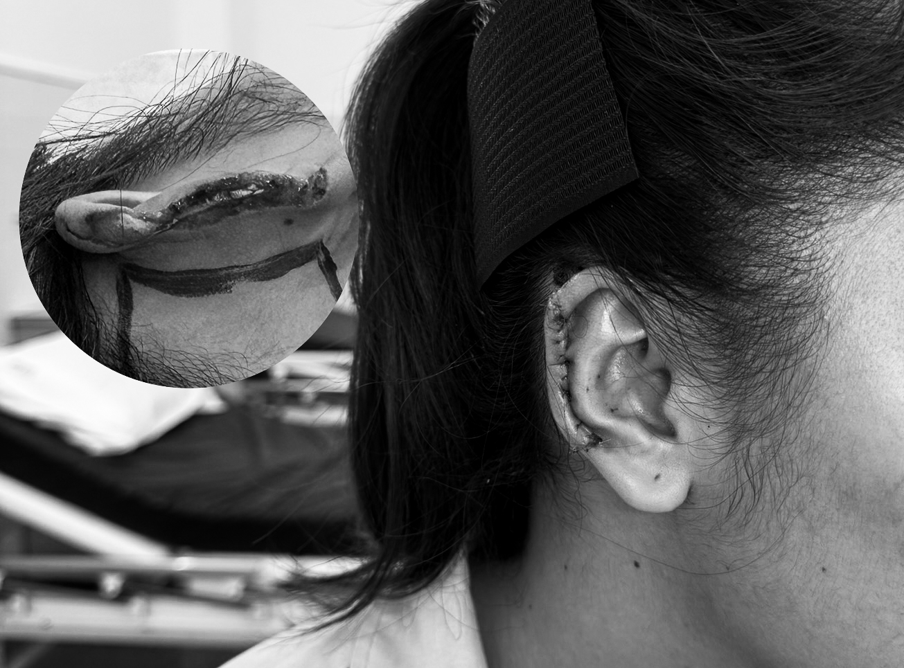 Trước tổn thương phức tạp, các bác sĩ đã xây dựng kế hoạch tái tạo vành tai theo từng giai đoạn. Ở lần phẫu thuật đầu tiên, ê-kíp tiến hành lấy và chuyển vạt da sau tai lên che phủ vùng da và sụn vành tai bị mất. Đây là bước quan trọng nhằm tạo lớp mô mềm phù hợp, đồng thời tái lập hệ thống mạch máu nuôi dưỡng cho vành tai. Da sau tai được lựa chọn vì có cuống mạch tốt, tỷ lệ sống cao và màu sắc tương đồng với da tai.