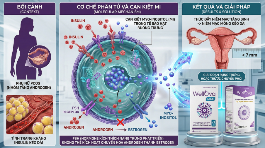 Ở phụ nữ mắc PCOS (đặc biệt là nhóm tăng androgen), tình trạng kháng insulin kéo dài dẫn đến cạn kiệt Myo-inositol (MI) trong tế bào hạt buồng trứng. Điều này khiến FSH (hormone kích thích nang trứng phát triển) không thể kích hoạt chuyển hóa androgen thành estrogen thúc đẩy niêm mạc tăng sinh, dẫn đến tình trạng niêm mạc mỏng kéo dài (dưới 7 mm vào giai đoạn rụng trứng hoặc trước chuyển phôi).
