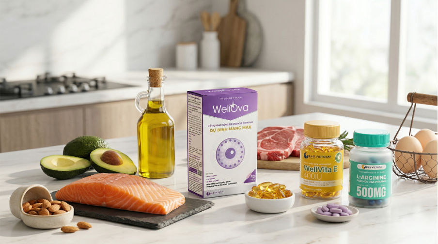 Bên cạnh bổ sung nhóm inositol, phụ nữ niêm mạc mỏng còn có thể kết hợp bổ sung vitamin E nguyên chất bằng WellVita E 400IU chiết xuất từ đậu nành Mỹ hoặc L-Arginine nhằm hỗ trợ quá trình tăng sinh NO ở mạch máu, tăng cường lưu thông và chống oxy hóa nhằm bảo vệ chất lượng niêm mạc nhằm tăng tỉ lệ đậu chuyển phôi IVF ở nhóm phụ nữ PCOS làm IVF/IUI.
