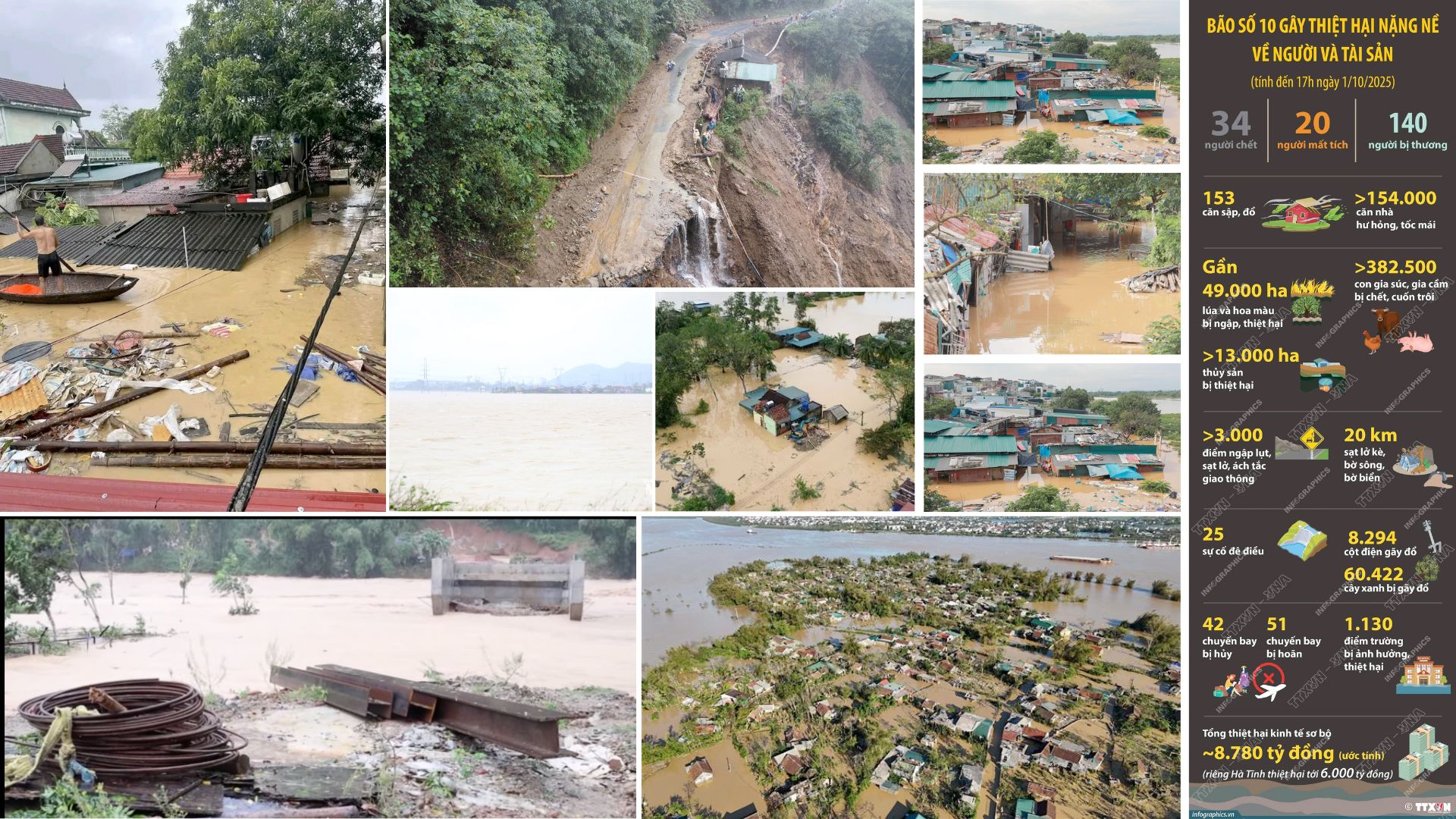 Song đến lúc này những con số về thiệt hại vẫn không ngừng tăng. Báo cáo của Cục Đê điều và Phòng chống thiên tai (Bộ NN&PTNT) cho biết: bão số 10 kèm mưa lớn, sạt lở, giông lốc đã làm 54 người chết và mất tích, 140 người bị thương; hơn 153 căn nhà sập đổ, trên 154.000 căn nhà tốc mái, hư hỏng; gần 49.000 ha hoa màu và hơn 13.000 ha thủy sản bị phá hủy; hơn 382.500 gia súc, gia cầm bị cuốn trôi; hơn 3.000 điểm ngập lụt, sạt lở xuất hiện gây ách tắc nghiêm trọng. Tổng thiệt hại ước tính khoảng 8.780 tỷ đồng. Đằng sau những con số lạnh lùng ấy là hàng chục ngàn phận người đang chật vật gượng dậy giữa đổ nát.