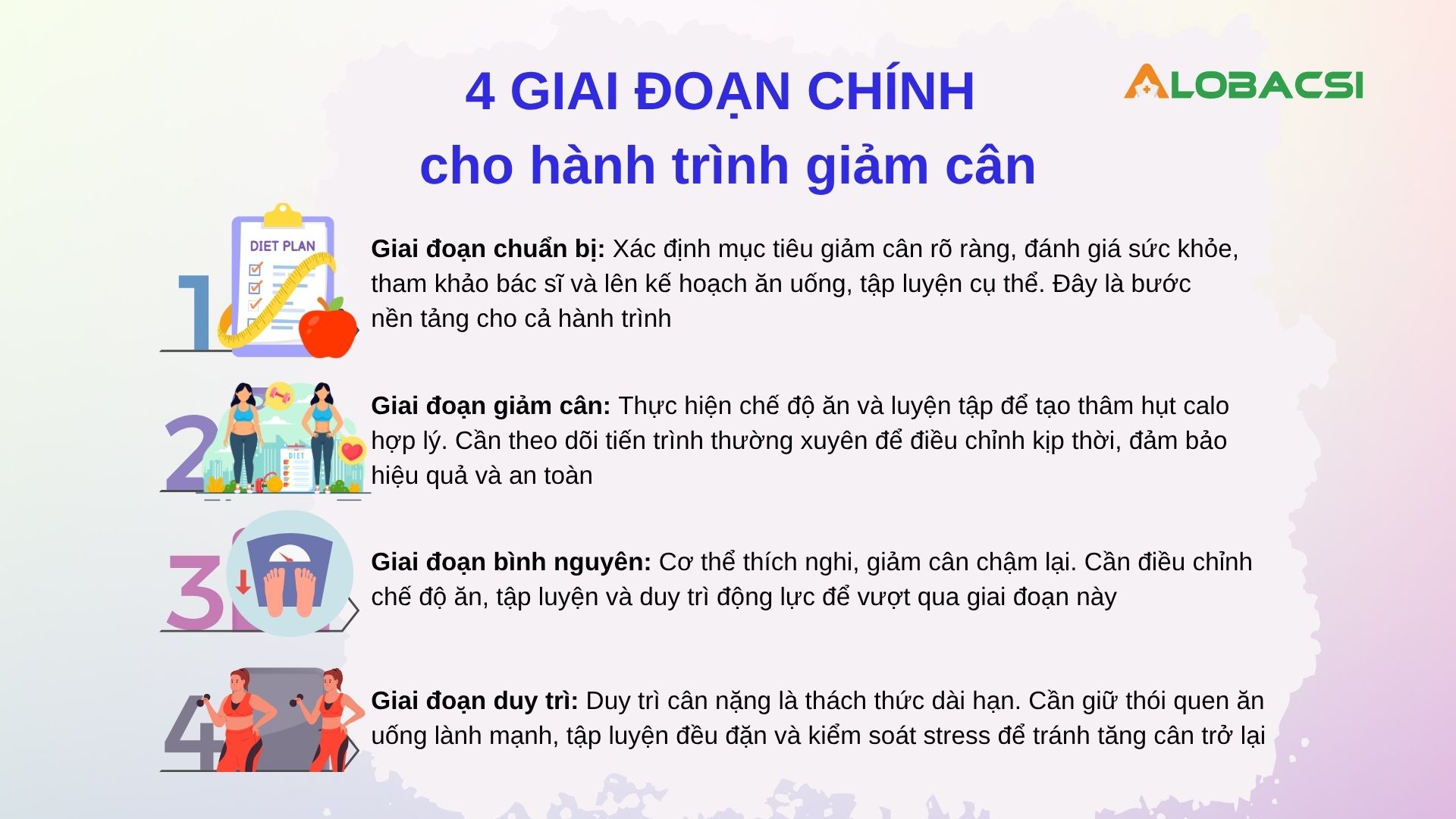 Mỗi giai đoạn đều có những yêu cầu riêng, do đó việc hiểu rõ và thực hiện đúng từng bước sẽ giúp quá trình giảm cân đạt hiệu quả lâu dài và bền vững.