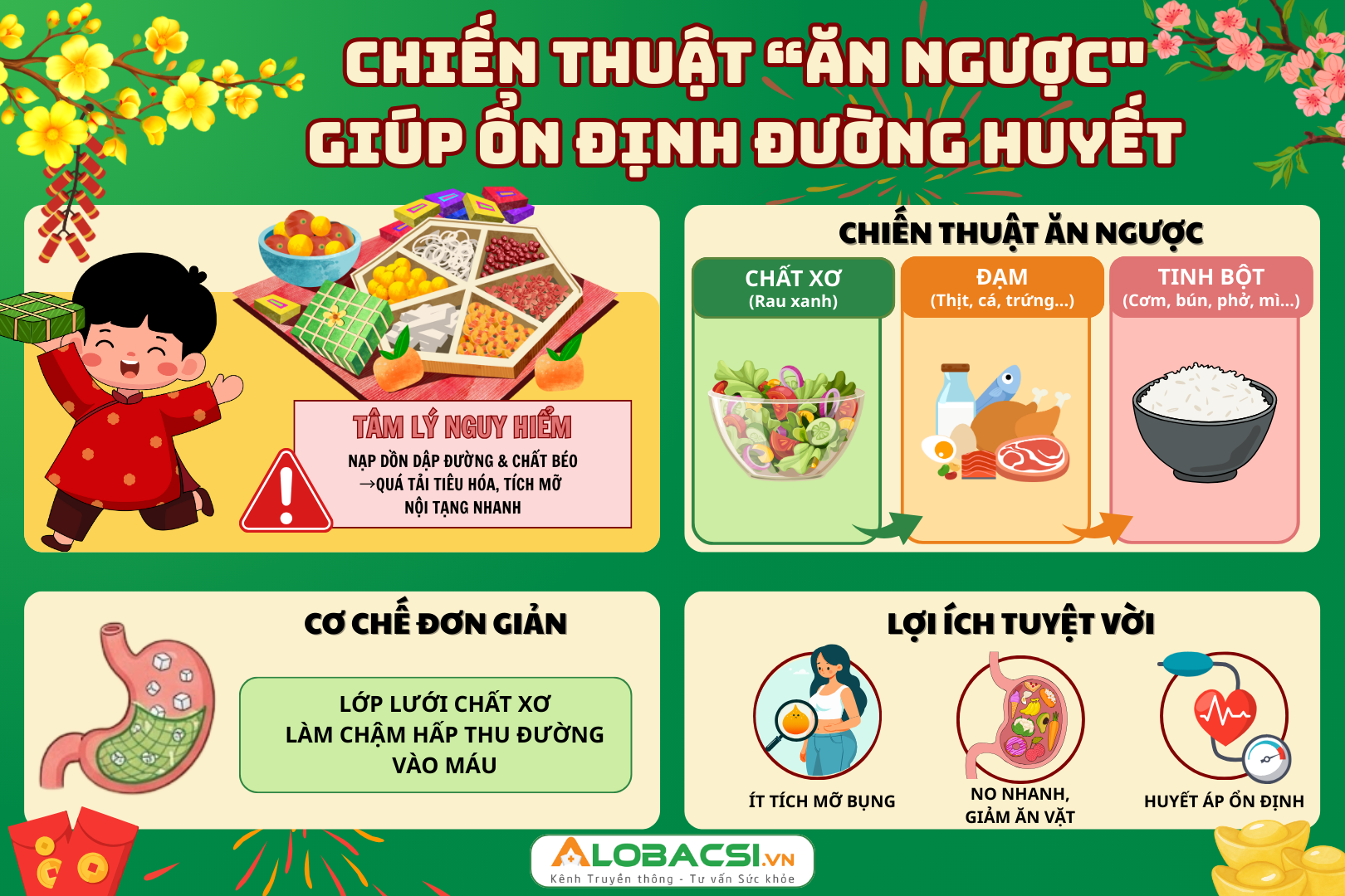Đừng để tiệc tùng những ngày Tết gây quá tải tiêu hóa và khiến đường trong máu tăng cao. Hãy áp dụng ngay chiến thuật "ăn ngược" để tận hưởng trọn vẹn niềm vui ẩm thực mà vẫn giữ được vóc dáng cân đối, kiểm soát tốt đường huyết cũng như phòng ngừa các biến chứng nguy hiểm.