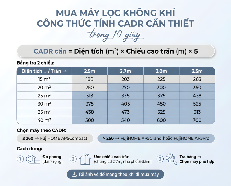 Diện tích phòng (m²) = CADR ÷ chiều cao trần ÷ 5