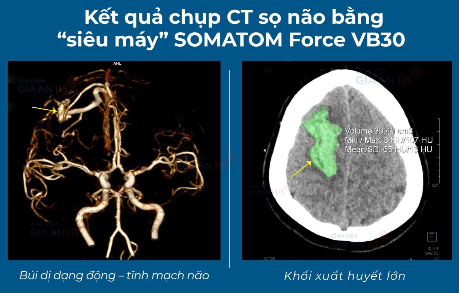 Bệnh nhân V.T.N.A (ngụ quận Bình Tân, TP.HCM) nhập viện lúc 5 giờ 30 sáng trong tình trạng đau đầu dữ dội, buồn nôn, liệt nửa người trái và lơ mơ. Kết quả chụp CT sọ não có tiêm thuốc cản quang bằng máy SOMATOM Force VB30 - dòng CT cao cấp nhất của Siemens (Đức) cho thấy khối máu tụ lớn ở vùng trán - đỉnh phải, thể tích gần 40cm³, lan vào não thất, gây phù não và thoát vị liềm não nguy hiểm.