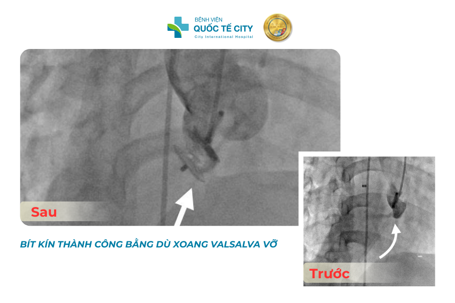 Thông qua đường động mạch và tĩnh mạch đùi, các bác sĩ đưa hệ thống ống thông tiếp cận đúng vị trí lỗ vỡ, triển khai thiết bị bít (dù) để đóng kín hoàn toàn luồng thông bất thường mà không làm tổn thương van động mạch chủ, không ảnh hưởng đến động mạch vành, đặc biệt là đảm bảo dòng máu tim trở lại sinh lý bình thường. Việc kiểm soát chính xác vị trí và kích thước thiết bị bít là yếu tố then chốt quyết định sự thành công của ca can thiệp.