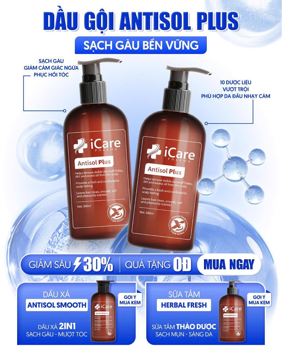 Trong xu hướng chăm sóc da đầu theo hướng dịu nhẹ và bền vững, các sản phẩm kết hợp dược liệu đang ngày càng được quan tâm. Antisol Plus - dòng dầu gội sạch gàu của iCare Pharma - được phát triển theo hướng sử dụng các chiết xuất có nguồn gốc thiên nhiên, hướng đến việc làm sạch và chăm sóc da đầu một cách cân bằng.