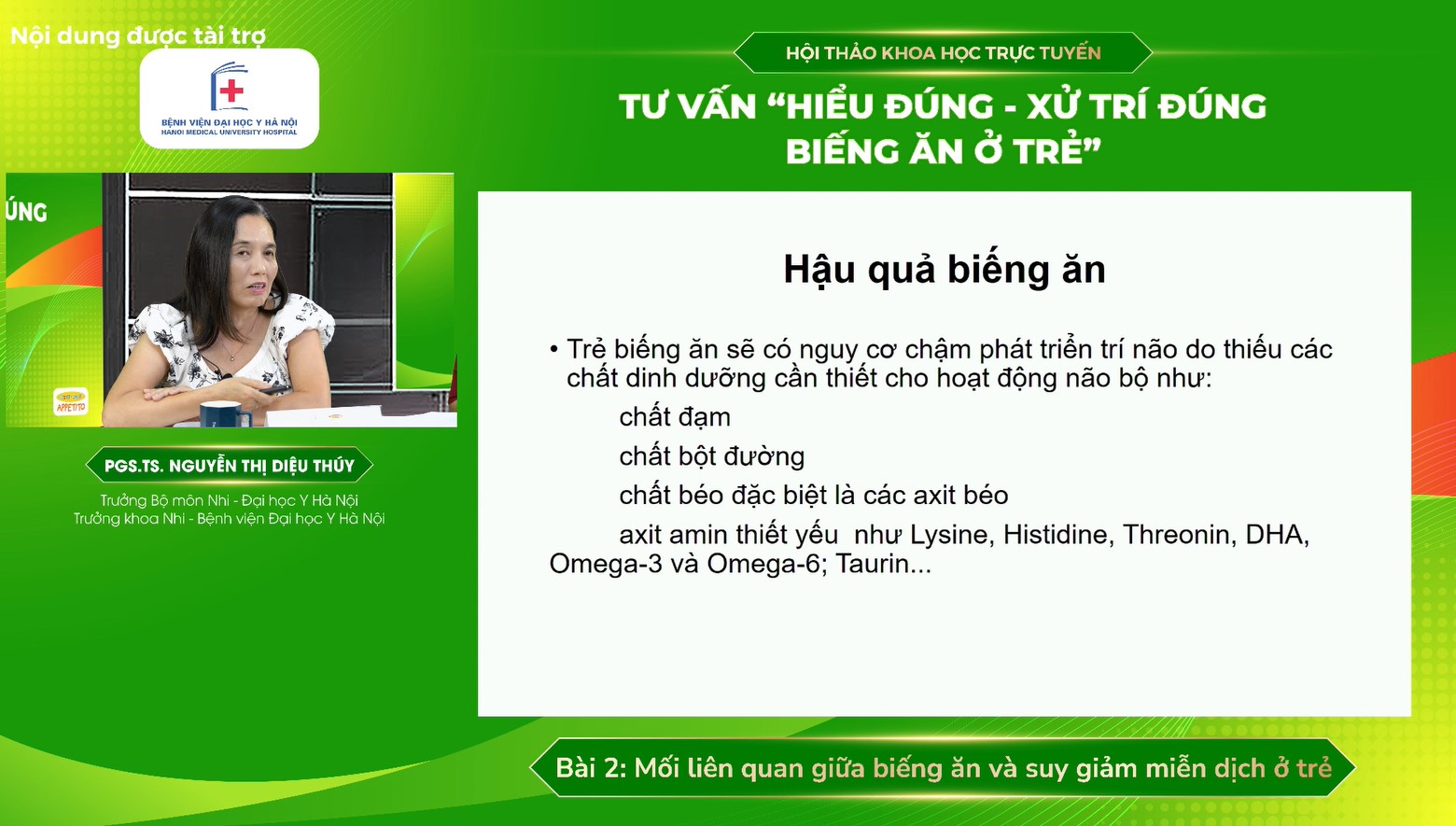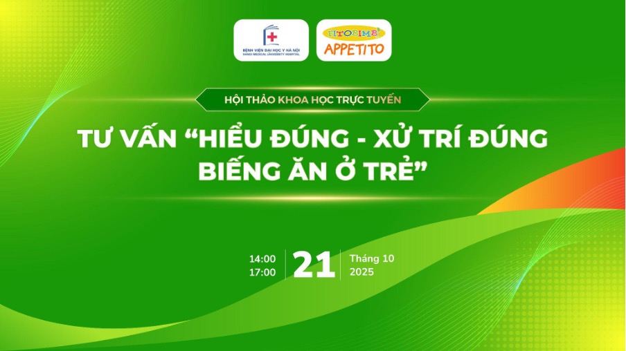 Chiều ngày 21/10/2025, Đại học Y Hà Nội đã tổ chức thành công Hội thảo khoa học trực tuyến “Hiểu đúng - Xử trí đúng biếng ăn ở trẻ”, với sự đồng hành tài trợ của nhãn hàng Fitobimbi Appetito - Siro ăn ngon 3 tác động nhập khẩu nguyên hộp từ Italy.