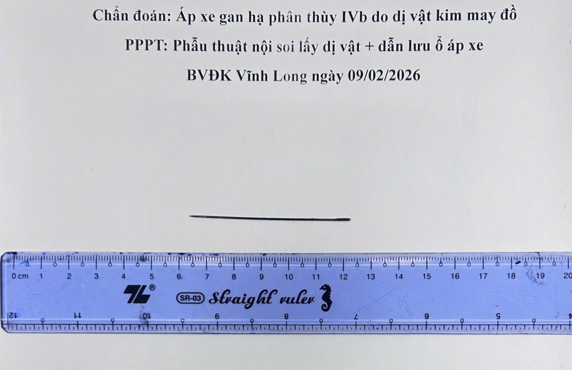 Ngày 9/2/2026, bệnh nhân T.T.L. (41 tuổi, ngụ tỉnh Vĩnh Long) nhập viện trong tình trạng đau bụng dữ dội vùng thượng vị kèm sốt cao. Qua thăm khám lâm sàng kết hợp siêu âm ổ bụng và chụp CT-scan, các bác sĩ phát hiện ổ áp xe gan kích thước khoảng 5 x 6 cm, bên trong có dị vật kim loại dài khoảng 6 cm.
