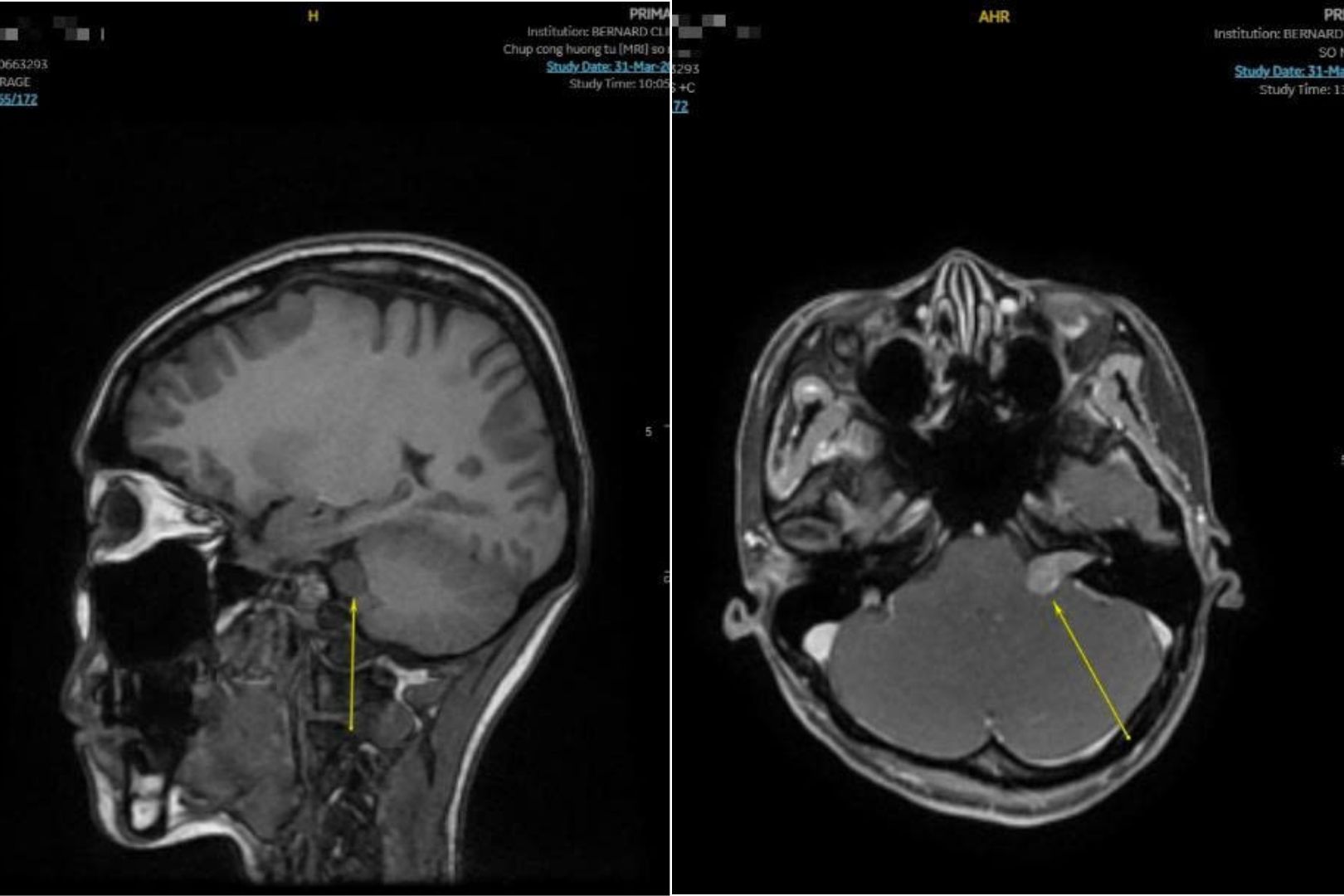 Đến khám vì đau đầu và ù tai trái kéo dài, một phụ nữ 32 tuổi không ngờ mình lại mang một khối u bao dây thần kinh nằm sâu ở góc cầu - tiểu não. Nhờ chỉ định MRI đúng thời điểm tại Bernard Healthcare, tổn thương được phát hiện sớm, tránh nguy cơ tiến triển âm thầm có thể ảnh hưởng thính giác và chức năng thần kinh.