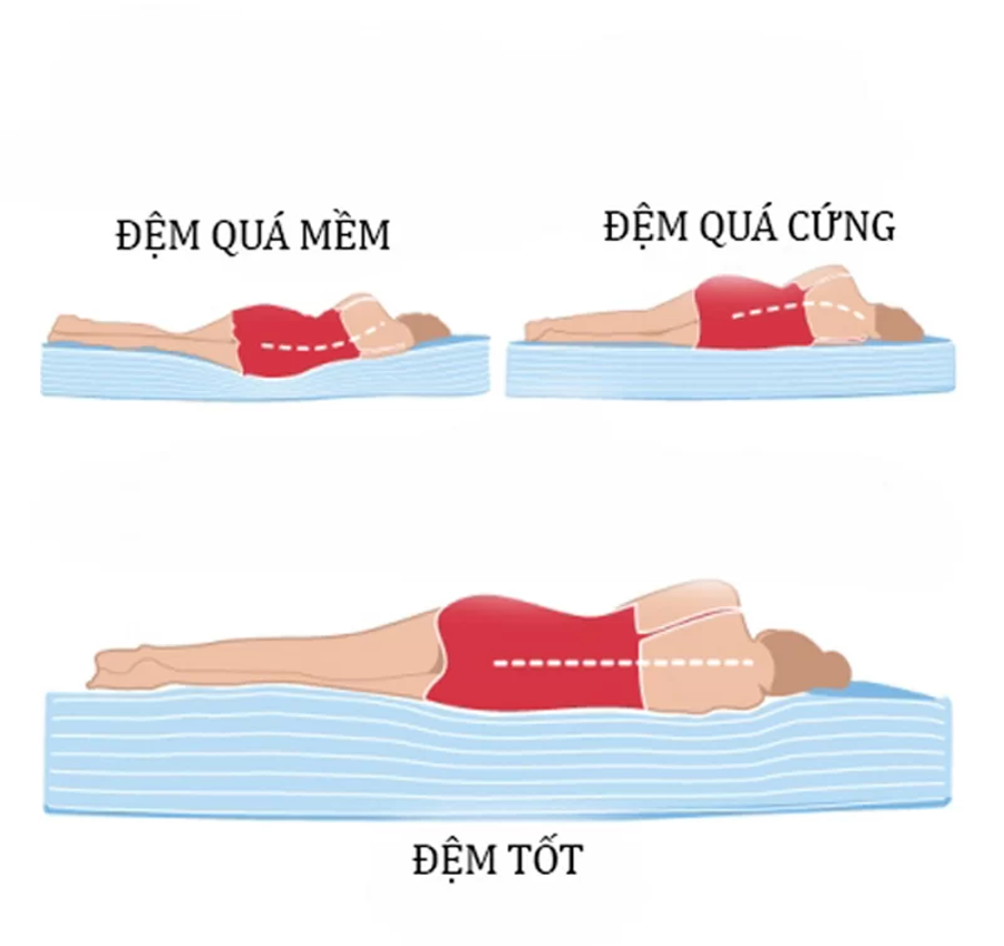 Chính vì sự khác biệt này, người đau lưng không nên chọn nệm quá cứng hay quá mềm mà nên ưu tiên nệm có độ cứng trung bình (medium-firm) để đảm bảo vừa nâng đỡ đúng, vừa đủ êm ái cho cột sống.