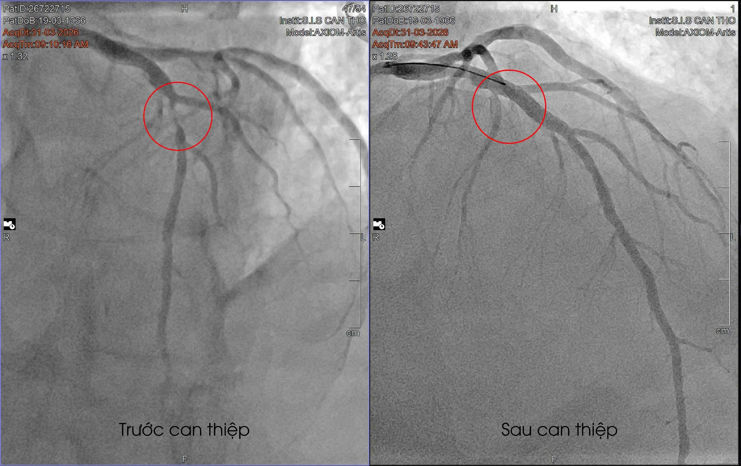 May mắn, dòng máu tại vị trí hẹp vẫn còn lưu thông rất nhỏ, giúp bệnh nhân chưa rơi vào biến chứng nặng. Ê-kíp đã tiến hành can thiệp đặt stent kịp thời. Sau can thiệp, các triệu chứng cải thiện rõ rệt, bệnh nhân hết đau ngực, không còn khó thở và nhanh chóng hồi phục, có thể sinh hoạt bình thường.