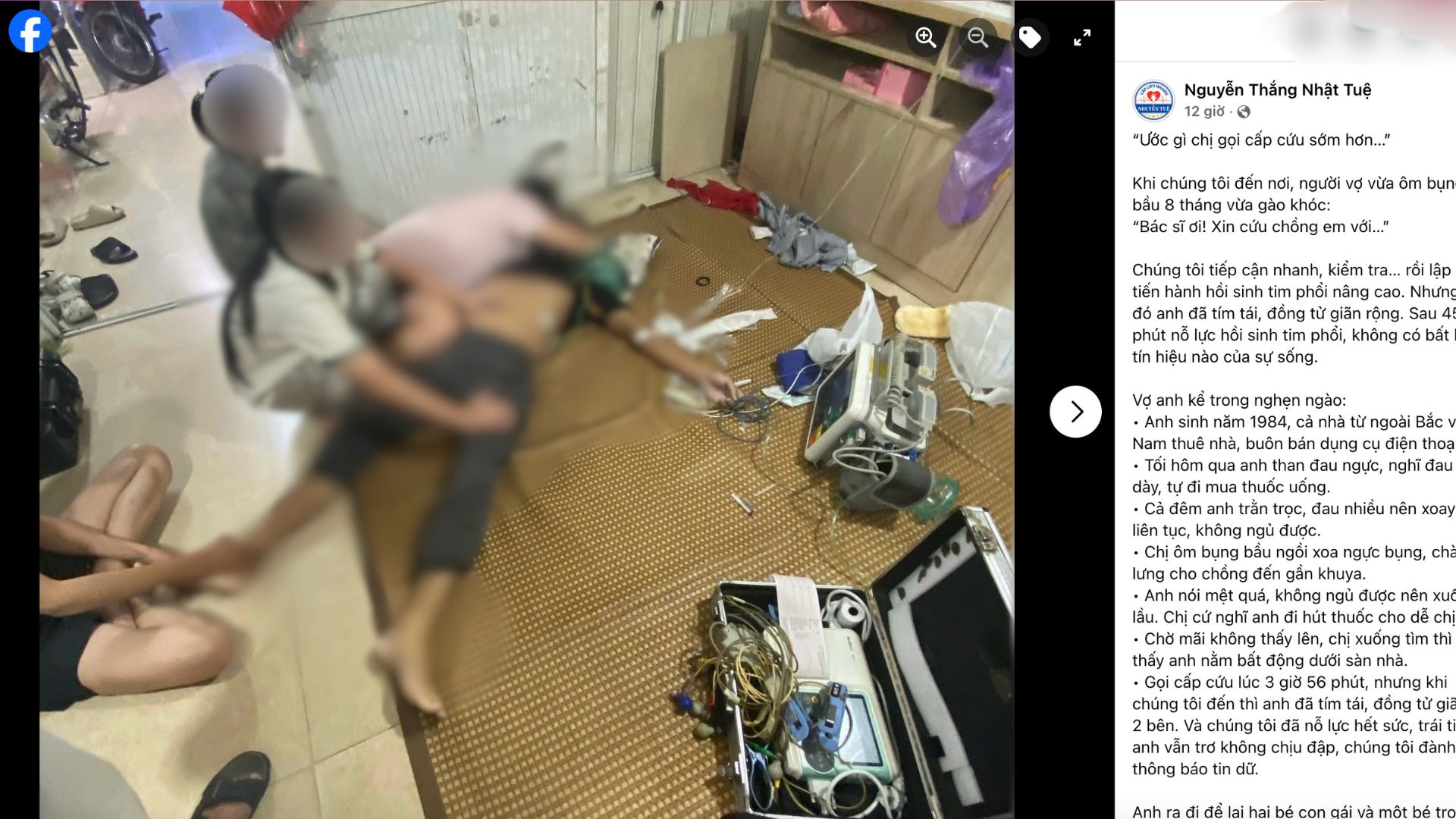 Một người đàn ông 41 tuổi đã tử vong dù đội cấp cứu nỗ lực hồi sinh tim phổi suốt 45 phút. Trước đó, anh đau ngực cả đêm nhưng tự nghĩ do dạ dày và không gọi cấp cứu. Bi kịch để lại người vợ mang thai 8 tháng và hai con nhỏ.