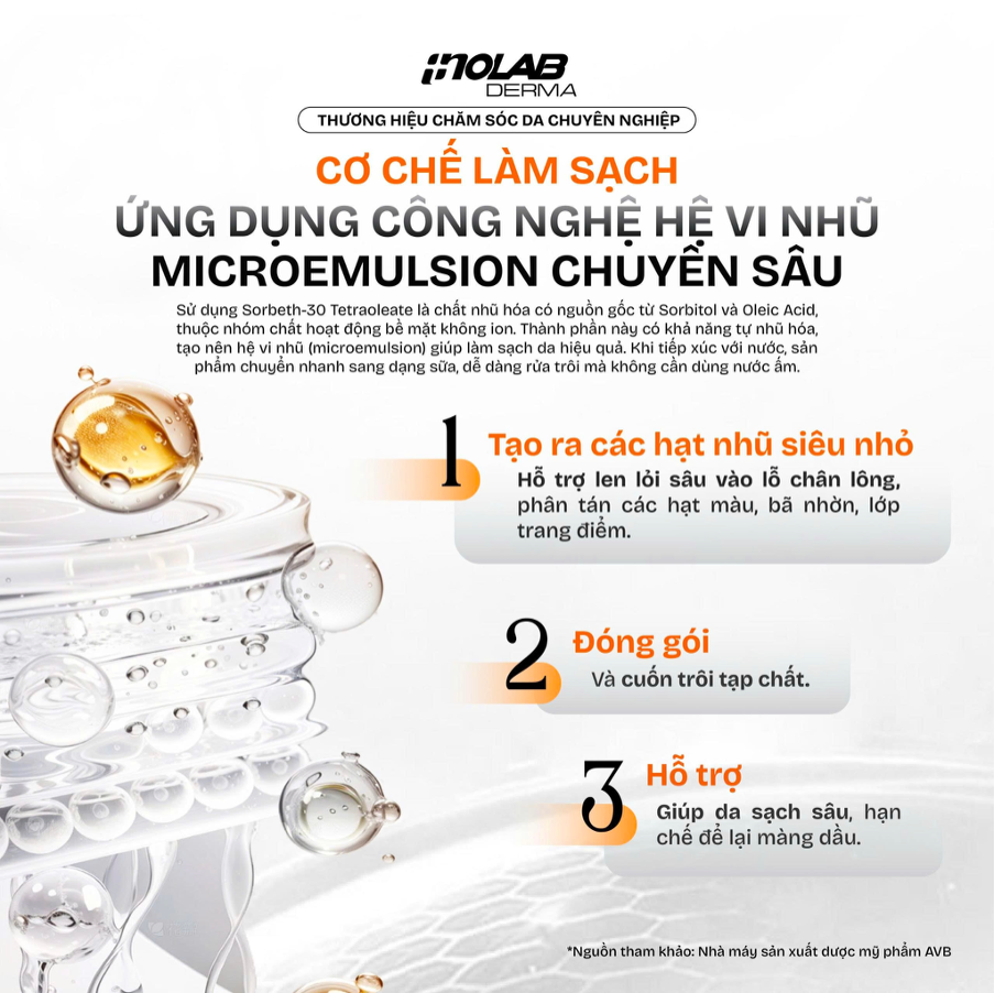 Các hạt vi nhũ có khả năng "đóng gói" cặn bẩn một cách chặt chẽ, lập tức chuyển thành dạng sữa ngay khi tiếp xúc với nước, giúp dễ dàng rửa trôi mà không cần đòi hỏi sử dụng nước ấm hay phải massage mạnh, để lại làn da thoáng sạch, mềm mịn tức thì.