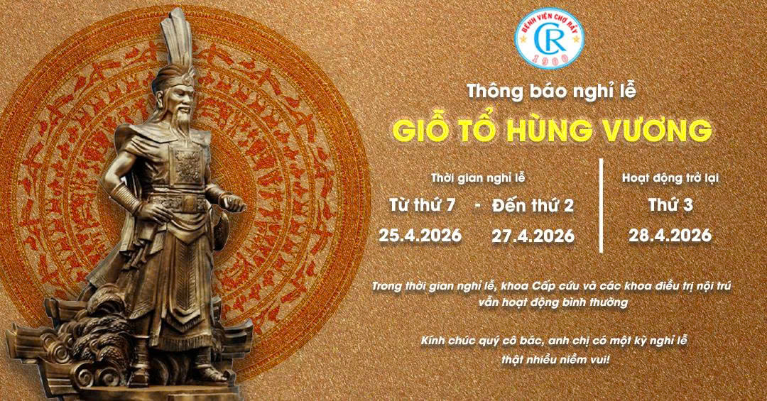 Lịch nghỉ lễ Giỗ tổ Hùng Vương (mùng 10 tháng 03 âm lịch) năm 2026 tại Bệnh viện Chợ Rẫy (địa chỉ ở 201B Nguyễn Chí Thanh, Phường Chợ Lớn, TP.HCM) được áp dụng như sau: