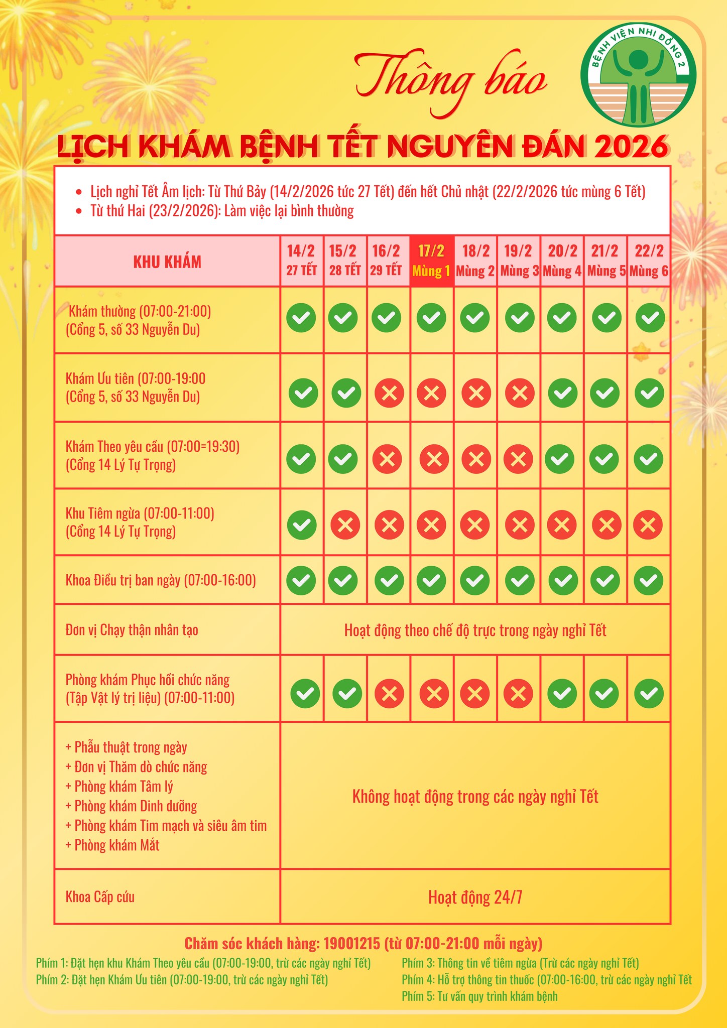 Chào AloBacsi, Tết Bính Ngọ này tôi lo lắng trẻ nhỏ trong nhà dễ ốm đau hoặc gặp các vấn đề sức khỏe đột xuất. Cho tôi hỏi Bệnh viện Nhi đồng 2 có tổ chức khám bệnh trong các ngày nghỉ Tết không? Lịch khám thường và khám dịch vụ cụ thể như thế nào? Mong được hỗ trợ thông tin sớm. Xin cảm ơn!" (Bạn đọc Luân - TPHCM)